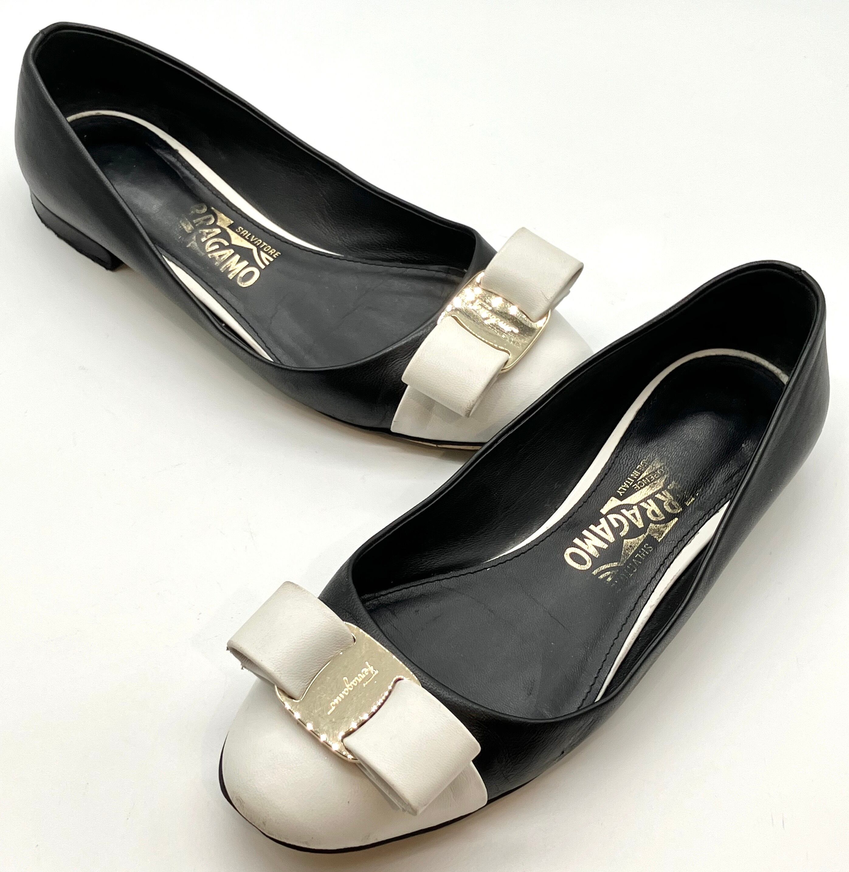 ホワイト×ブラックのバイカラーがキュートでおしゃれな、フェラガモの定番人気のヴァラリボンパンプスのフラットバージョンのヴァリナ。