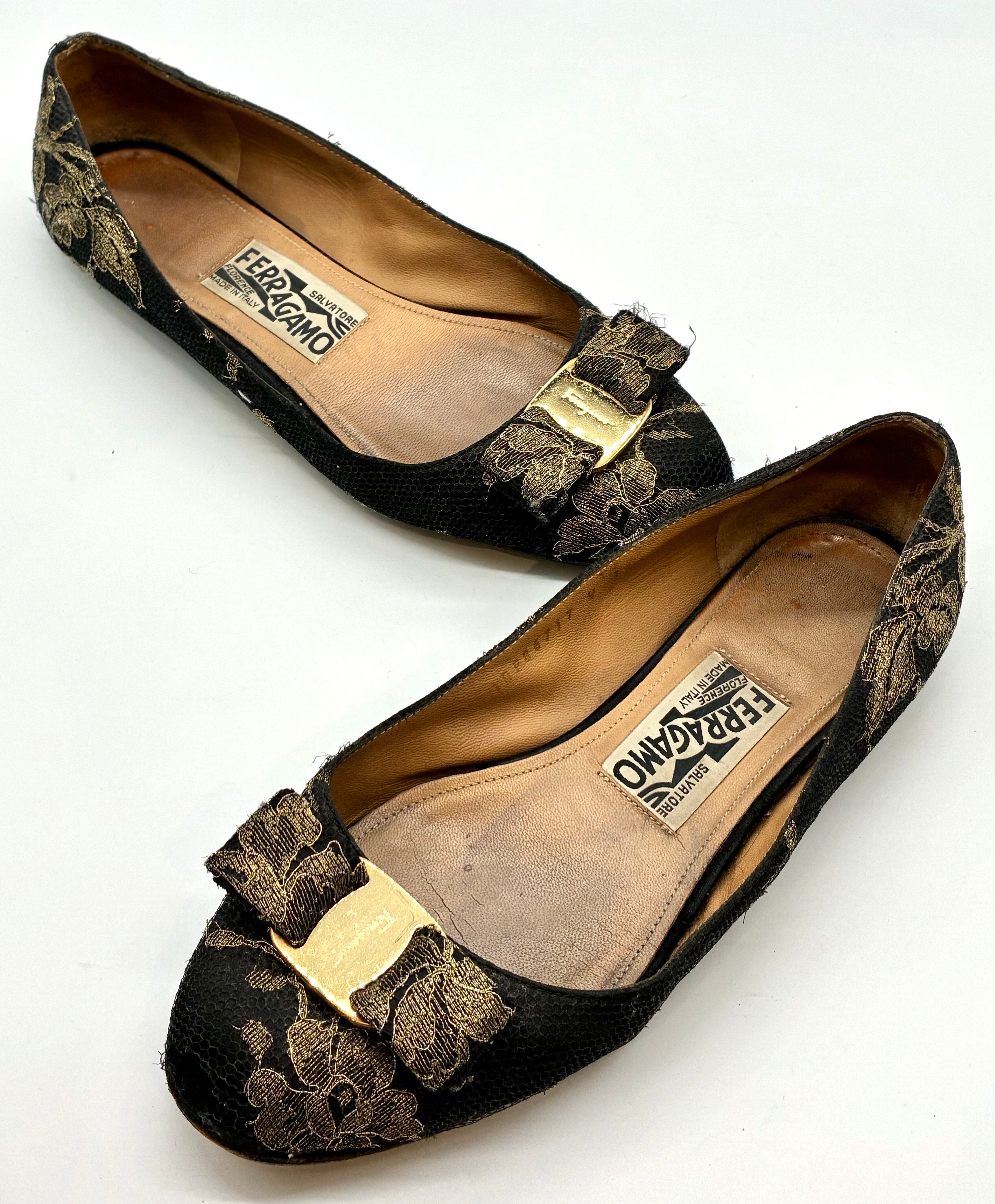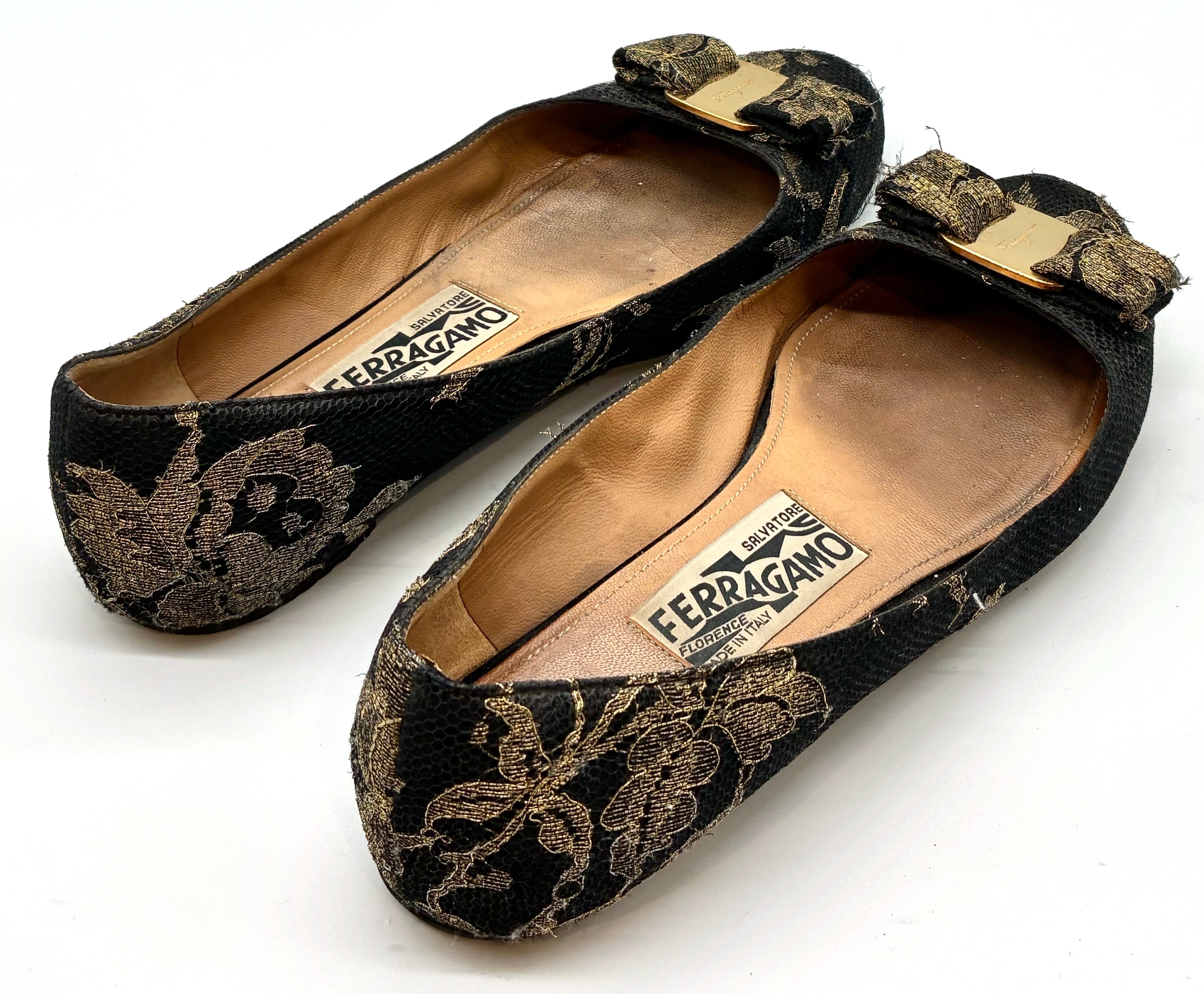 ブラック×ゴールドフラワーレースがゴージャスな、フェラガモの定番人気のヴァラリボンパンプスのフラットバージョンのヴァリナ。