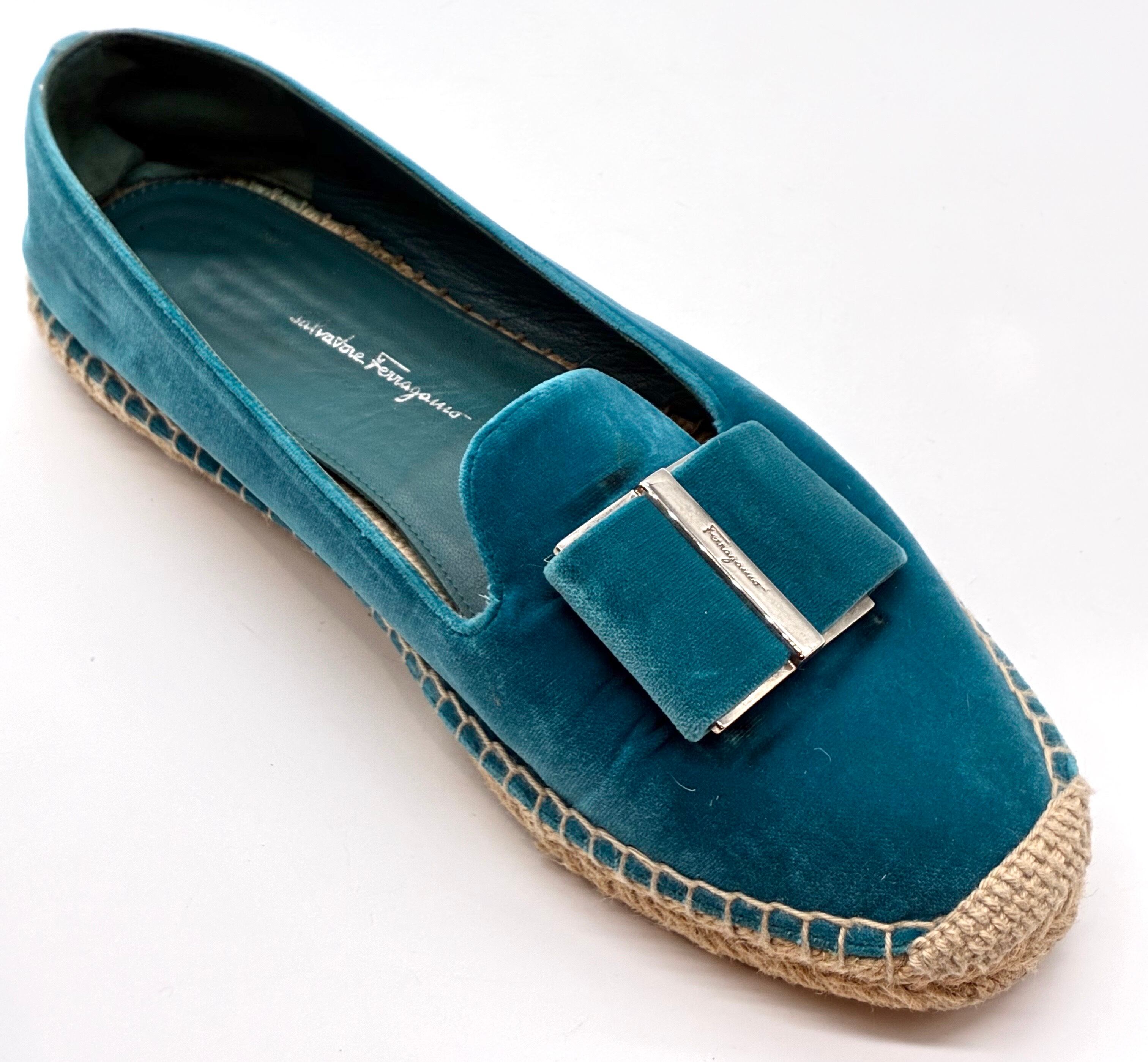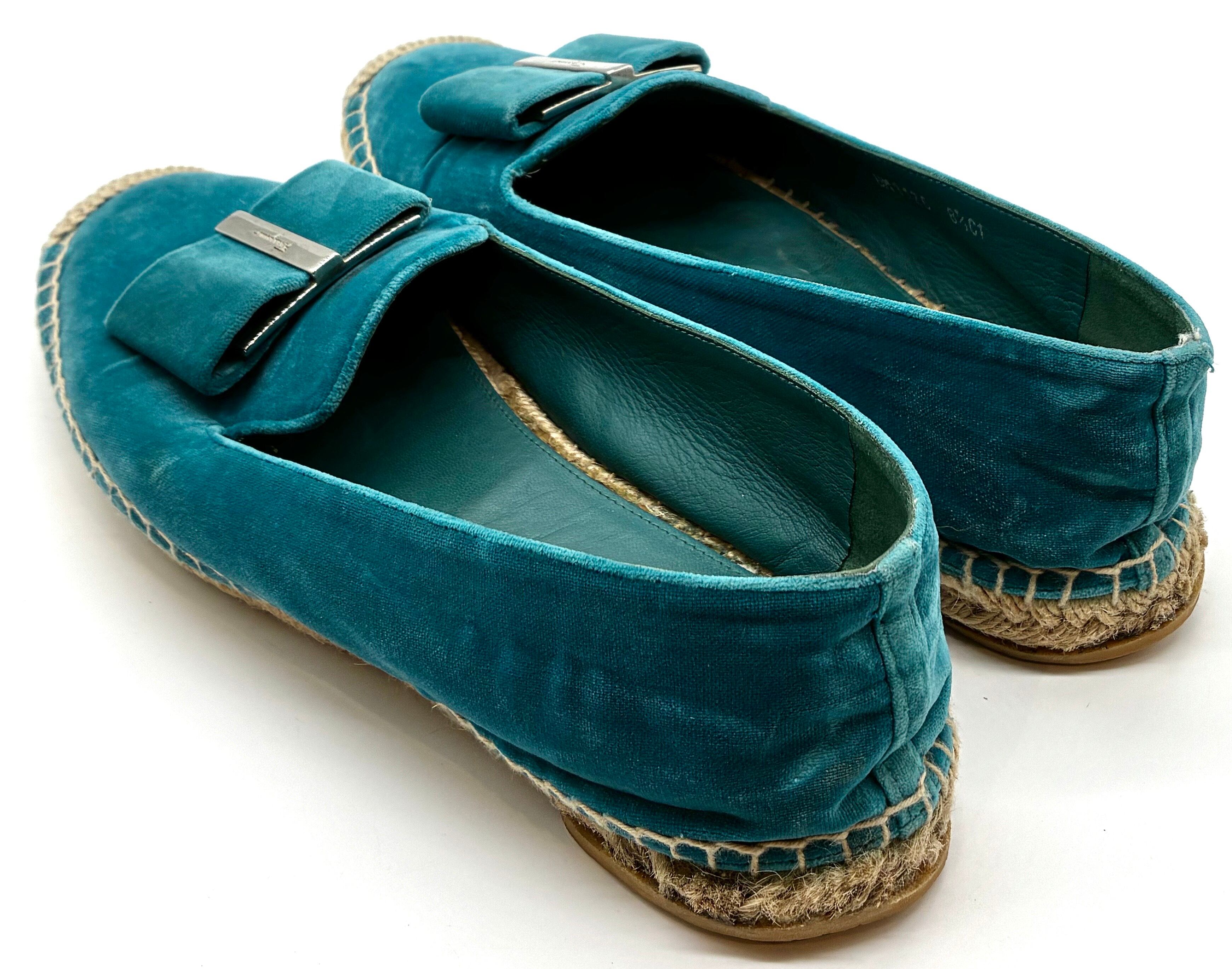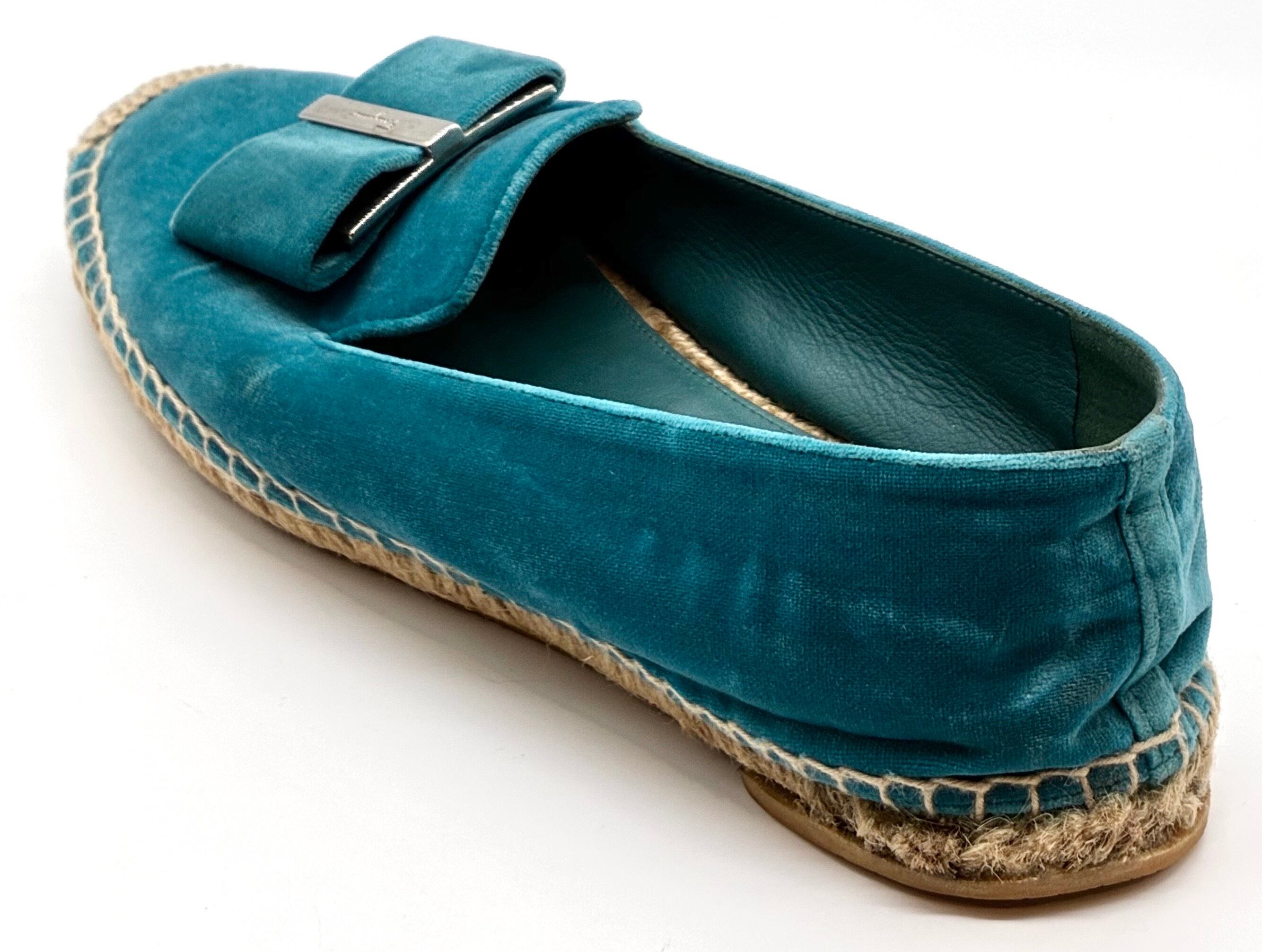 OLD FERRAGAMO(オールドフェラガモ) ターコイズブルーベロア×ビッグリボンエスパドリーユ 8 1/2C