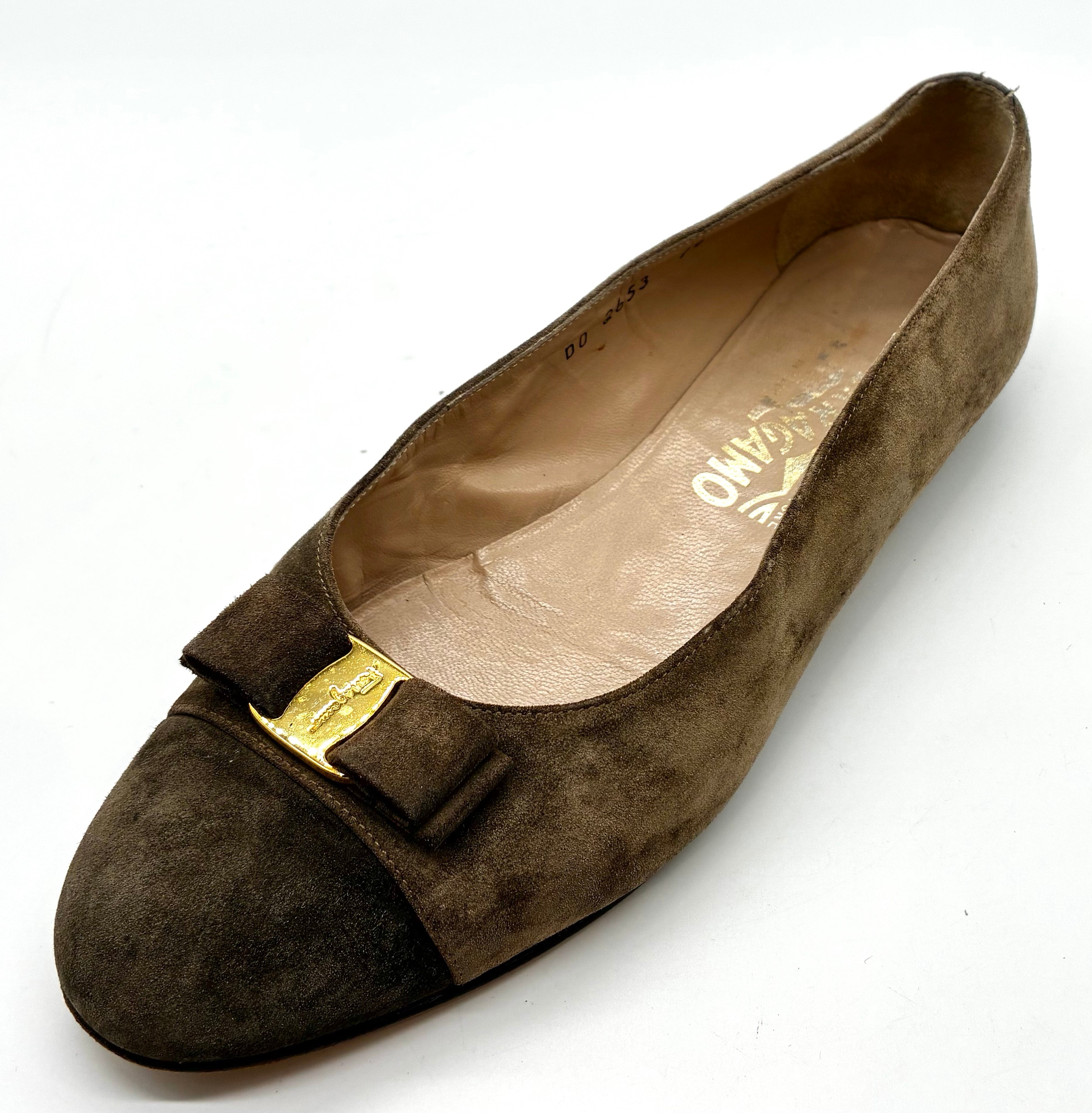 OLD FERRAGAMO(オールドフェラガモ)カーキ×グレージュバイカラースエードヴァラリボンフラットパンプス 8D