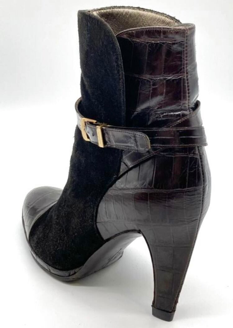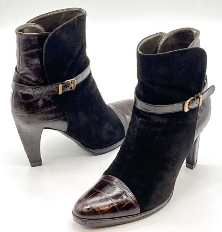 OLD FERRAGAMO(オールドフェラガモ) ブラックスエード×ダークブラウンクロコ型押しベルト付きショートブーツ 5C
