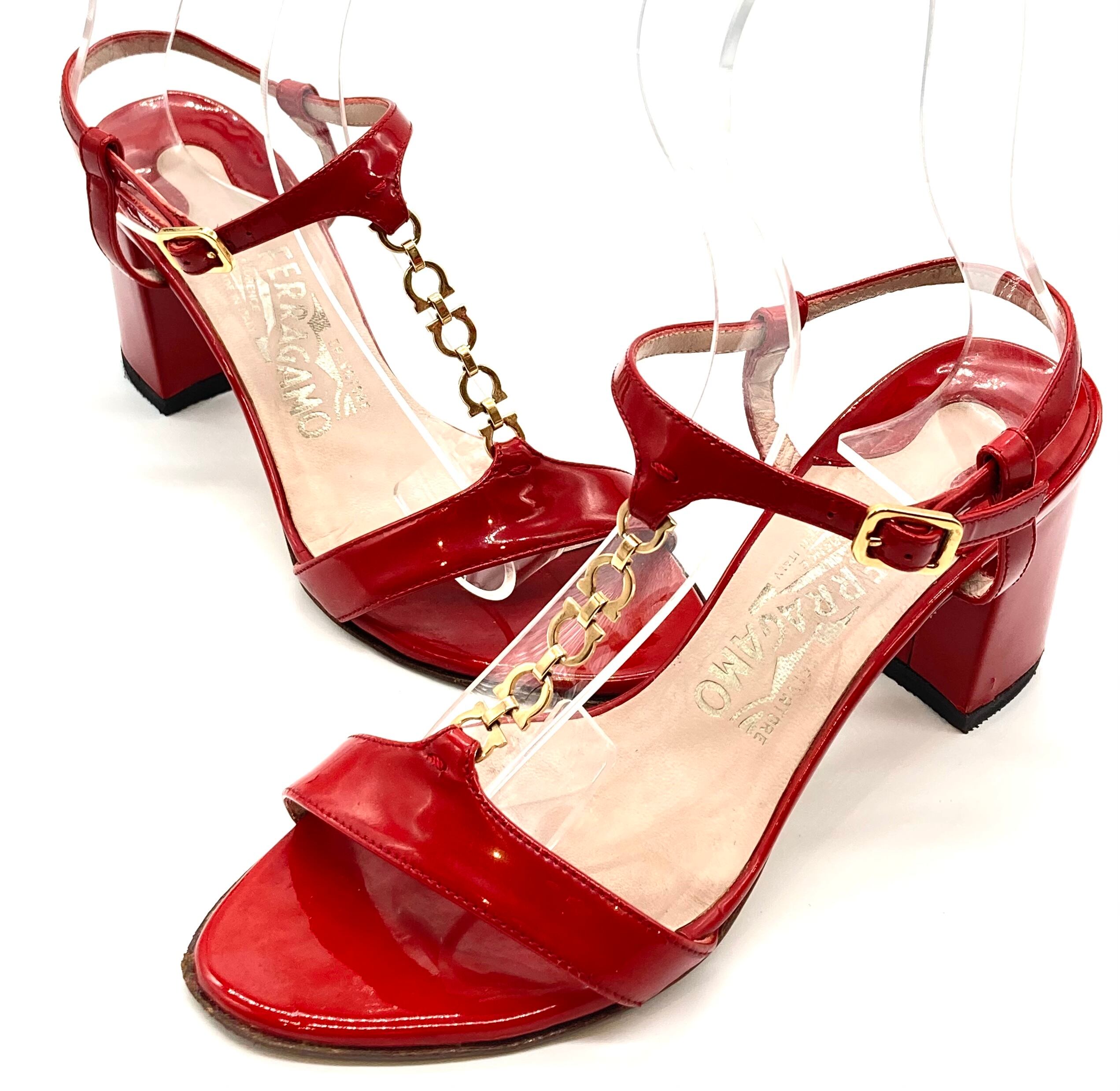 OLD FERRAGAMO(オールドフェラガモ) レッドパテント×ガンチーニチェーンアンクルストラップサンダル 5C