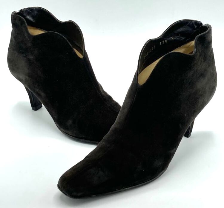 コンディション◆オールド・ヴィンテージの中古品になり、コンディションランクは中程度です。スエード特有の擦れやヒールに革ベルトめくれ傷(補修済み)、ファスナー塗装剥げが見られますが、濃い色なのであまりダメージは目立ちません。ソールにはラバーが貼ってあります。カカト新品交換済み。状態の詳細は写真をご覧くださいませ。