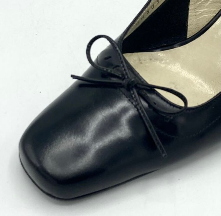 かっちりめのスクエアトゥからつながるバックストラップのデザインはしっかりと足を包み込んでくれるので、履きやすさも抜群。