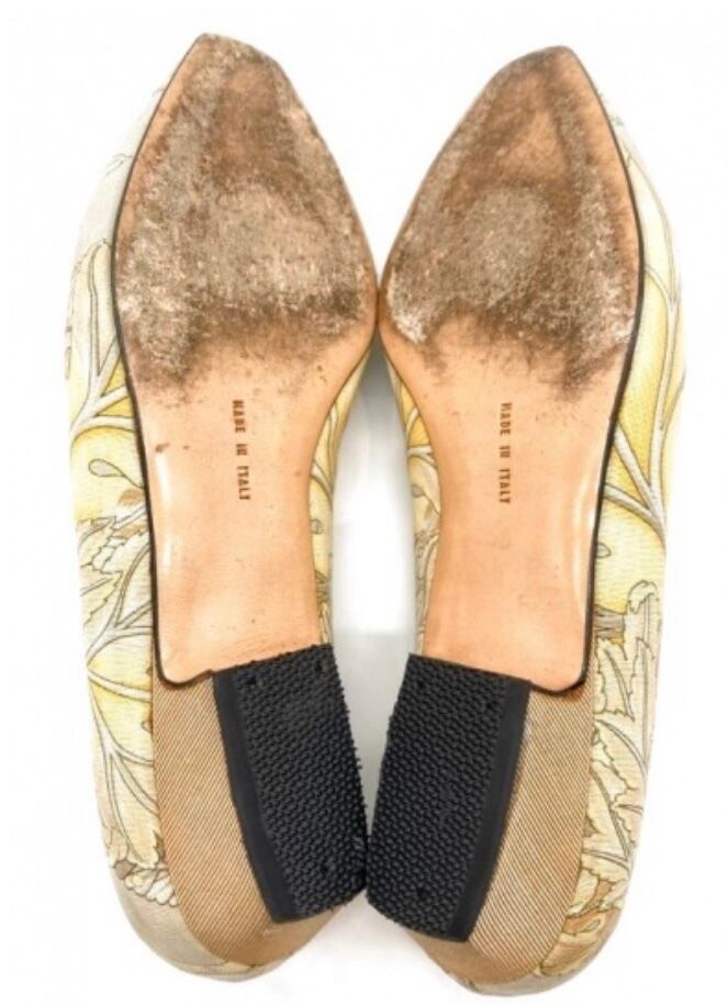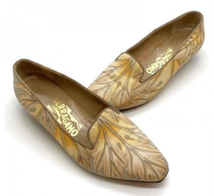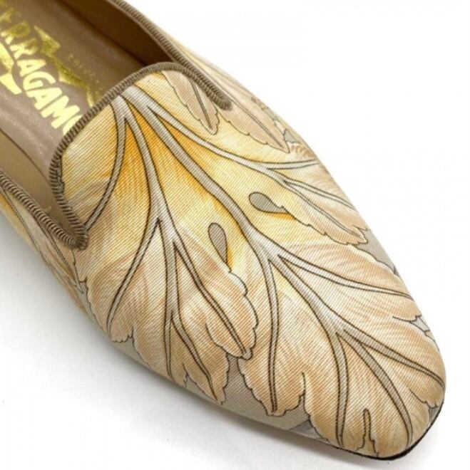 OLD FERRAGAMO(オールドフェラガモ) イエローベージュ×グレーリーフプリントスリッポンパンプス 6 1/2D
