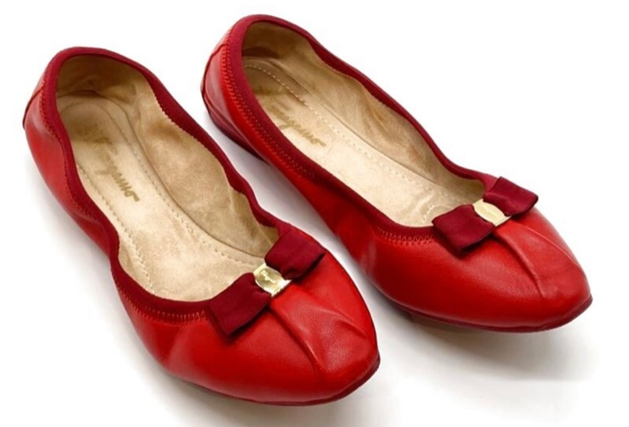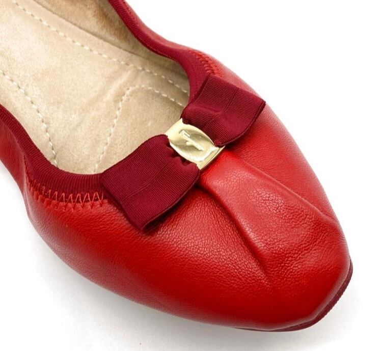 レッドレザーリボンバレエフラットシューズ MYJOY
