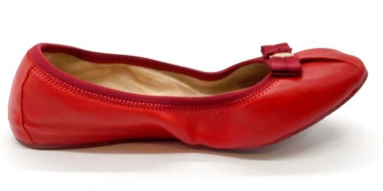真っ赤なレザーに少し濃いボルドー系の赤パイピングとリボンで足元が一気に華やかになります。