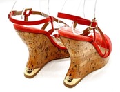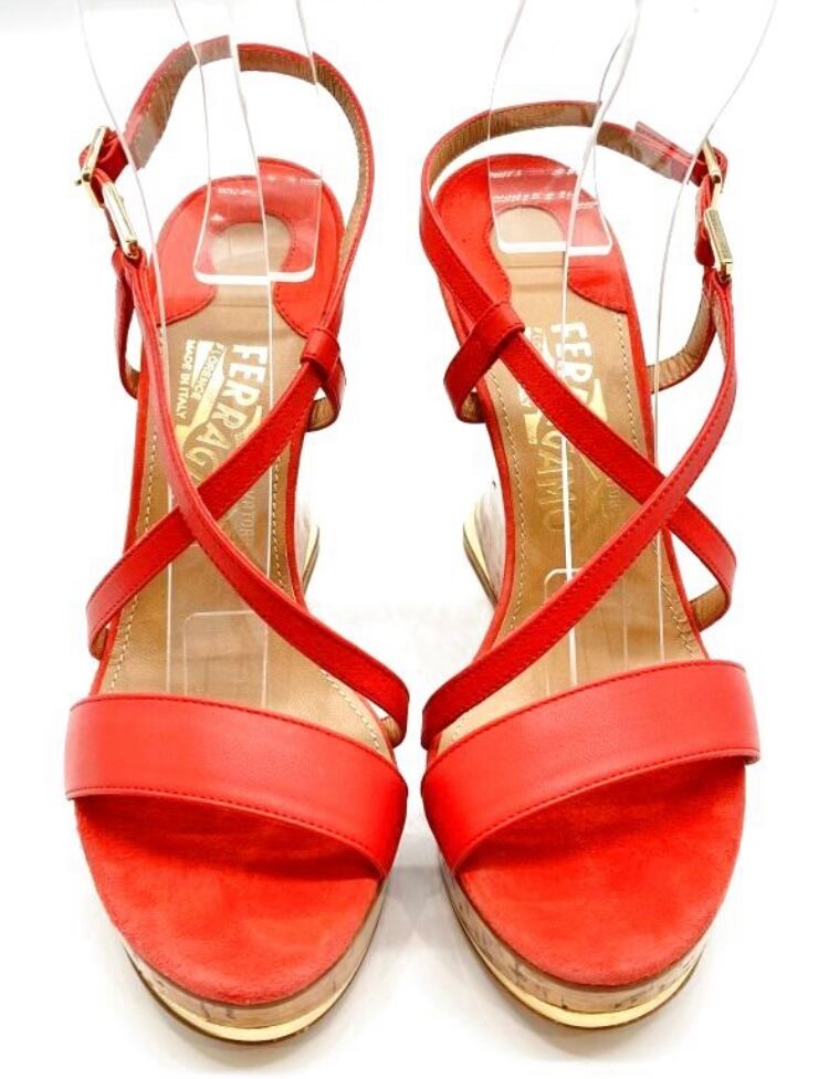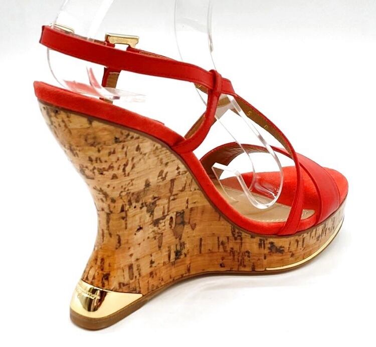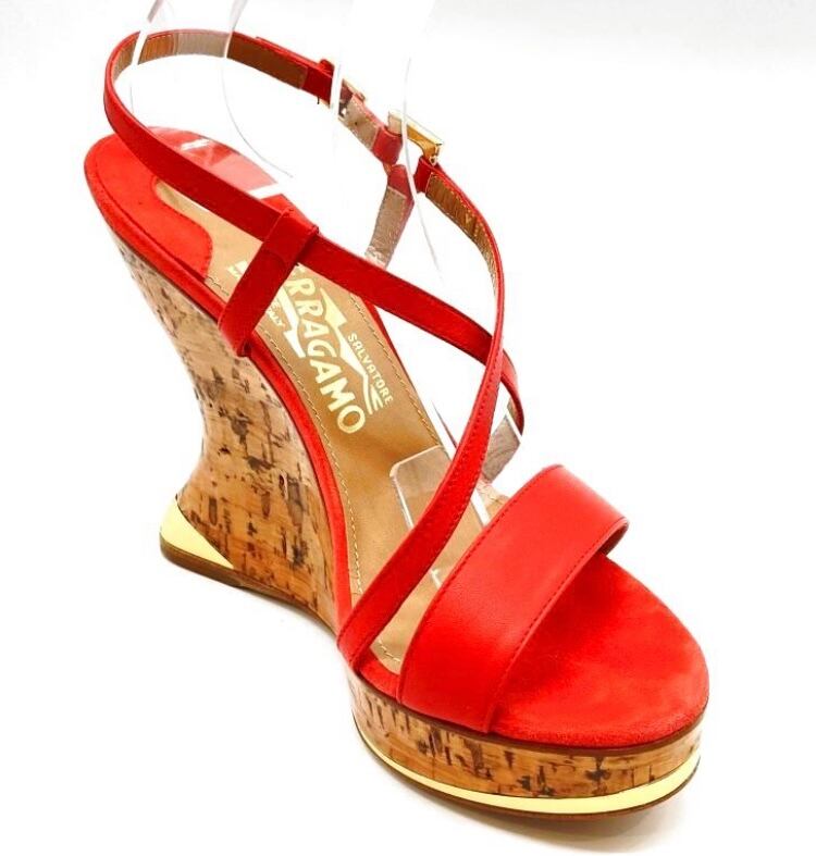 SALVATORE FERRAGAMO(サルヴァトーレフェラガモ)オレンジレッドレザー×コルクウェッジサンダル 5D [SHADE]