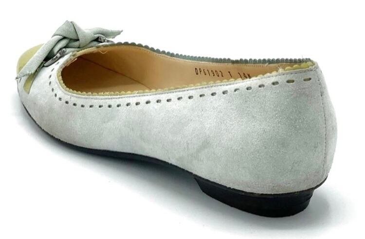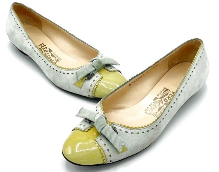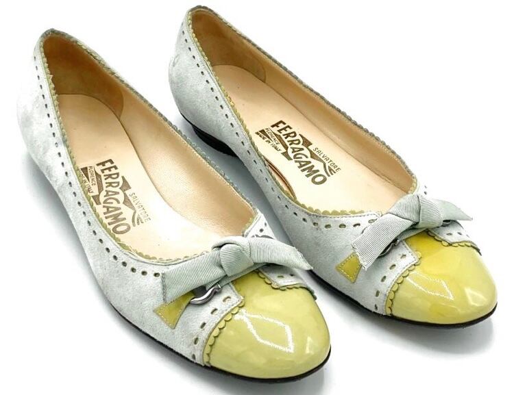 OLD FERRAGAMO(オールドフェラガモ) ライトグリーンスエード×パテントガンチーニリボンフラットパンプス 7C