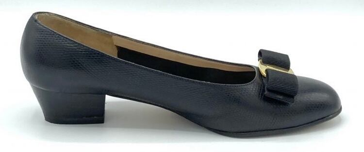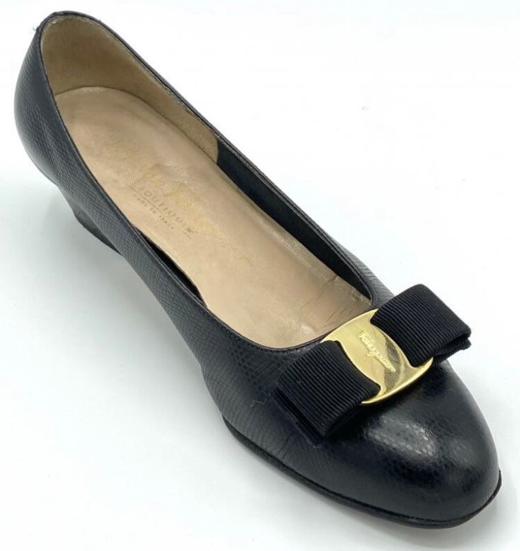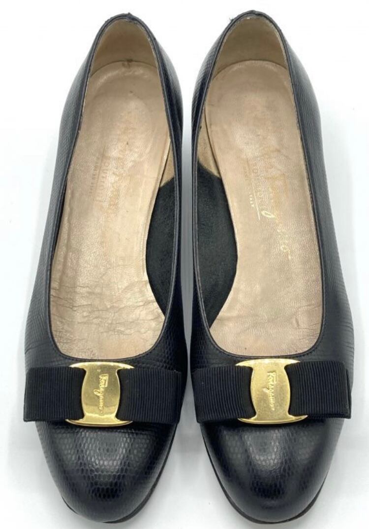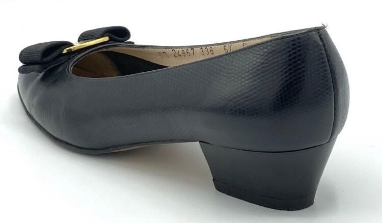 OLD FERRAGAMO(オールドフェラガモ) ブラック型押しレザーヴァラリボンパンプス 6 1/2C