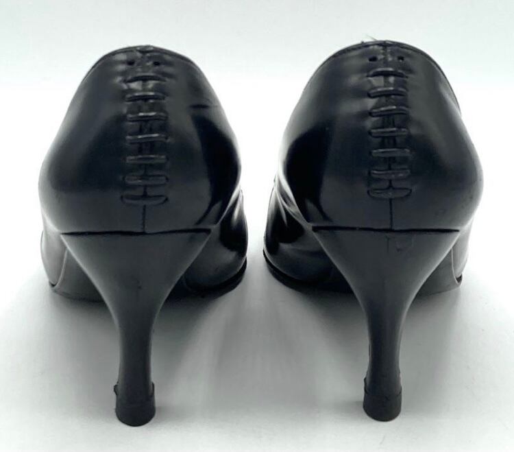 バックがレースアップ風になったシンプルなブラックレザーのパンプスはフレキシブルに活躍してくれる、一足は持っておきたい万能シューズ。