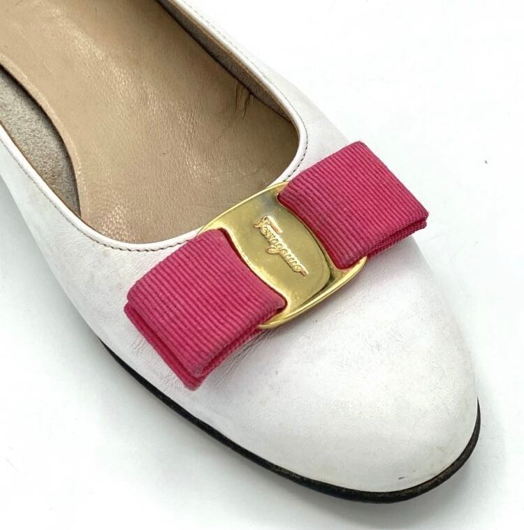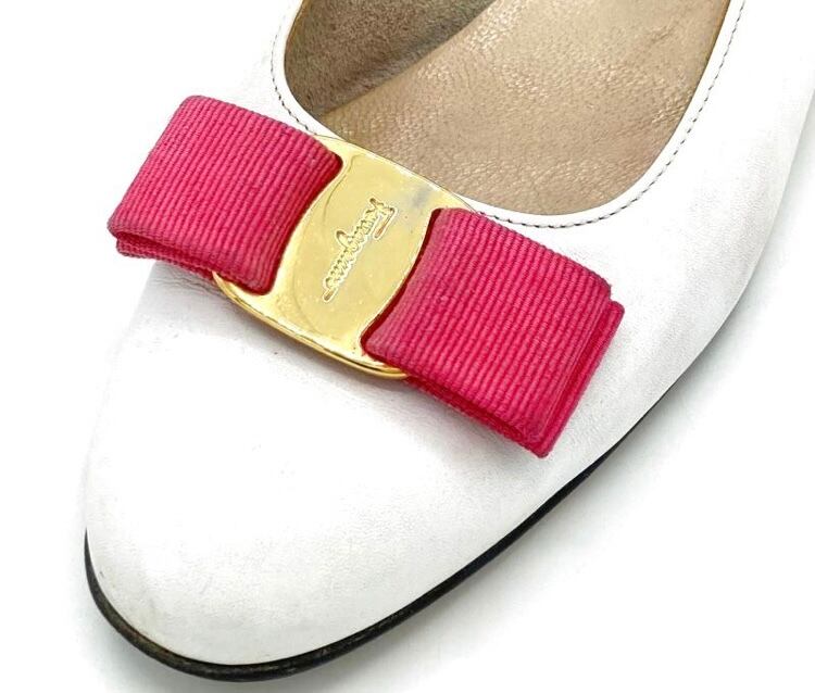 OLD FERRAGAMO(オールドフェラガモ) ホワイトレザー×ピンクヴァラリボンパンプス(リボンリカラー) 6C