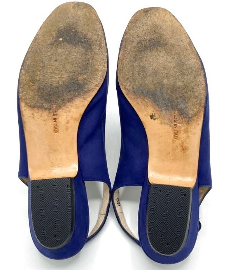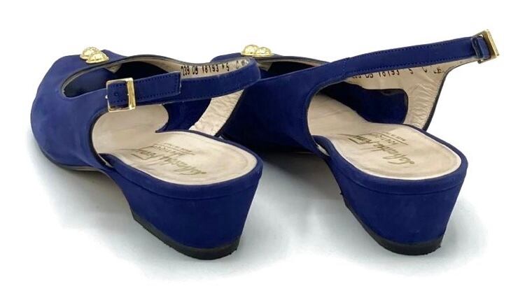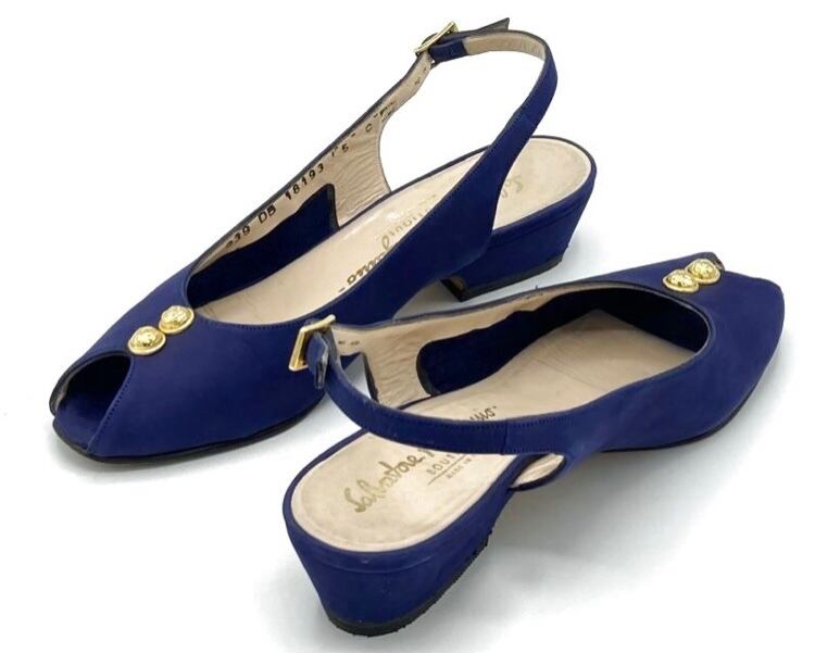 OLD FERRAGAMO(オールドフェラガモ) ブルーパープルスエード×シューズモチーフ金具付きサンダル 5C