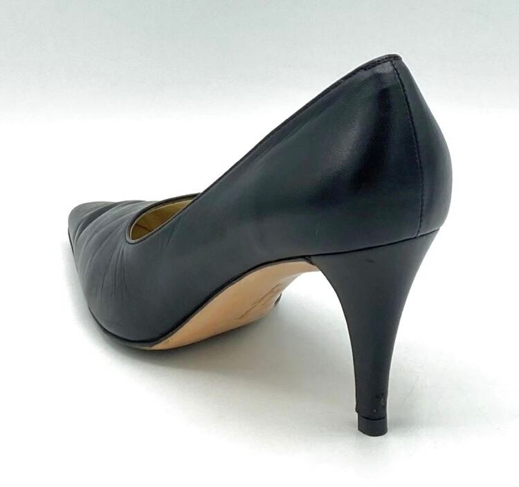 ブラックレザーのシンプルなポインテッドトゥと細めのヒールがクール。