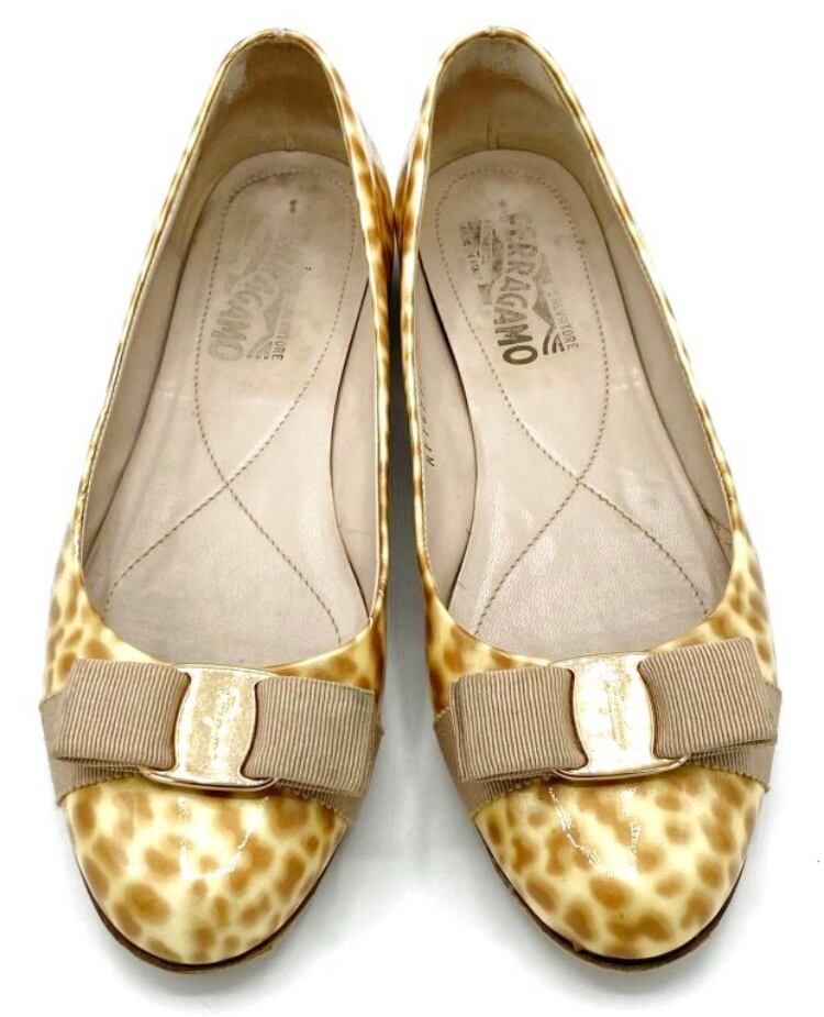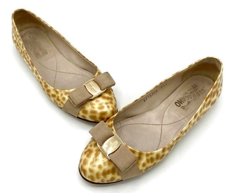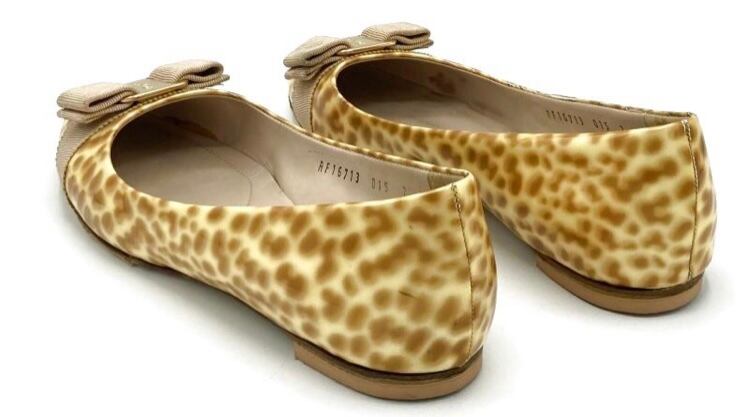 OLD FERRAGAMO(オールドフェラガモ) レオパードパテントヴァリナリボンフラットシューズ 7B