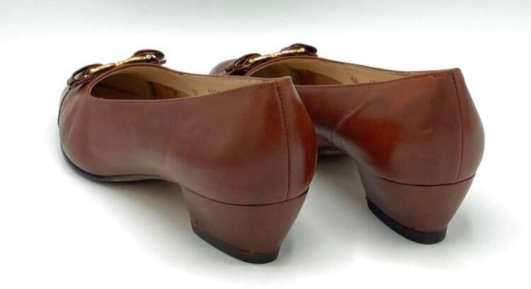 OLD FERRAGAMO(オールドフェラガモ) ブラウンレザー×ガンチーニゴールド金具リボンパンプス 7C