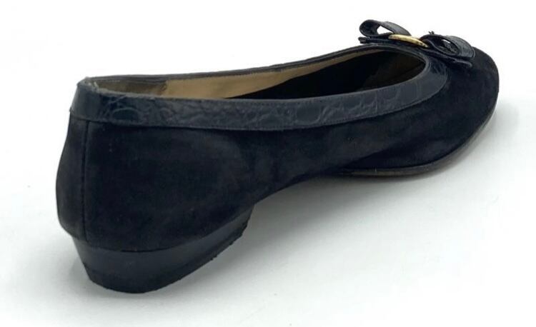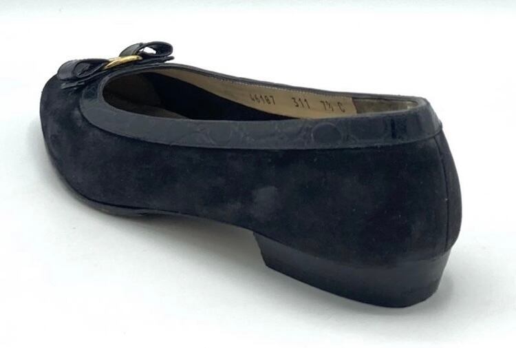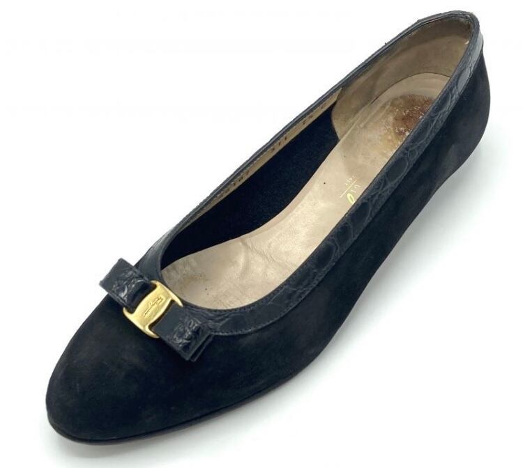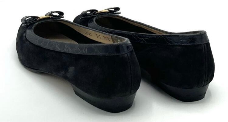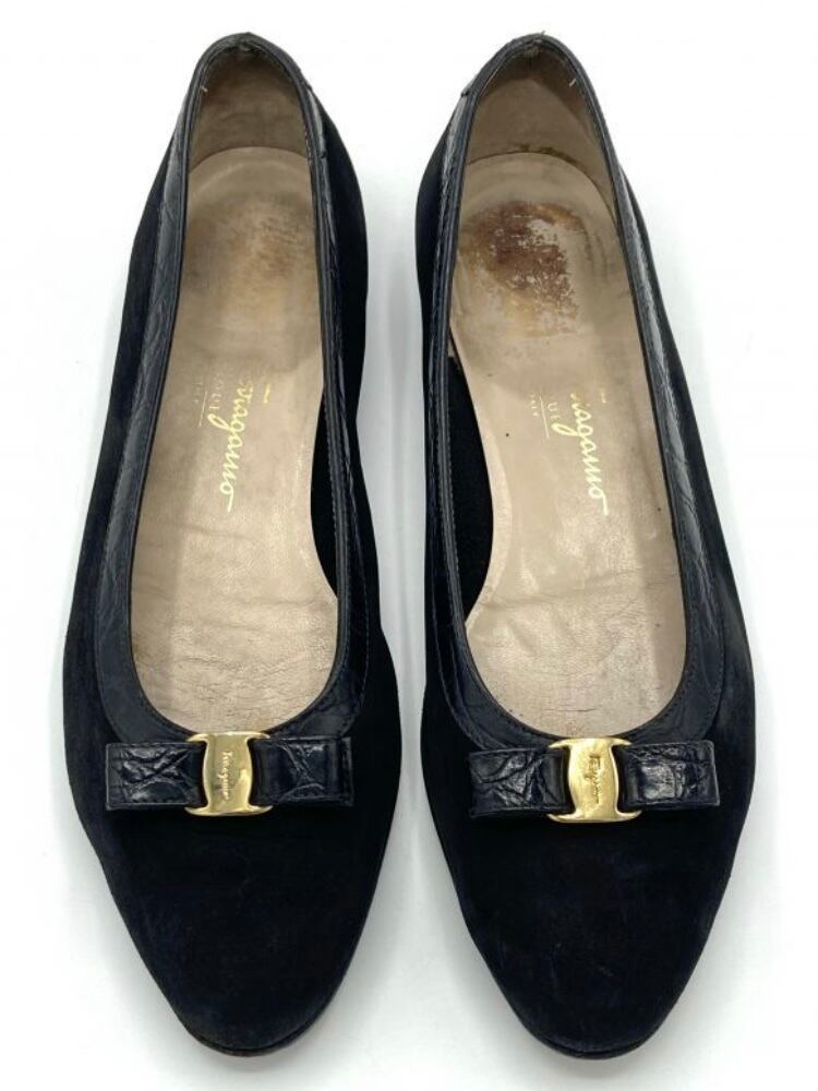 OLD FERRAGAMO(オールドフェラガモ/ヴィンテージ) ブラックスエード×型押しレザーリボン付きローヒールパンプス 7 1/2C