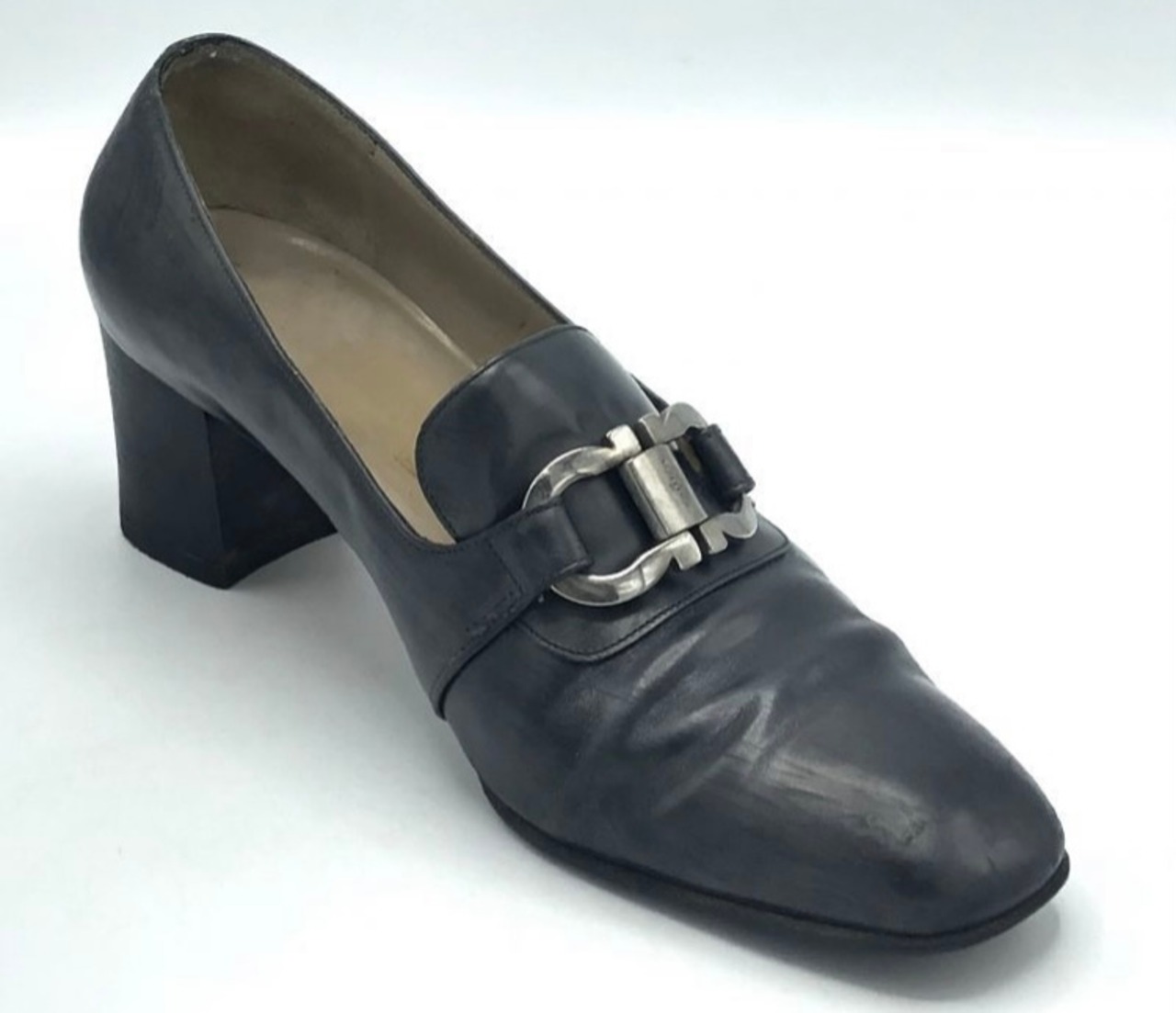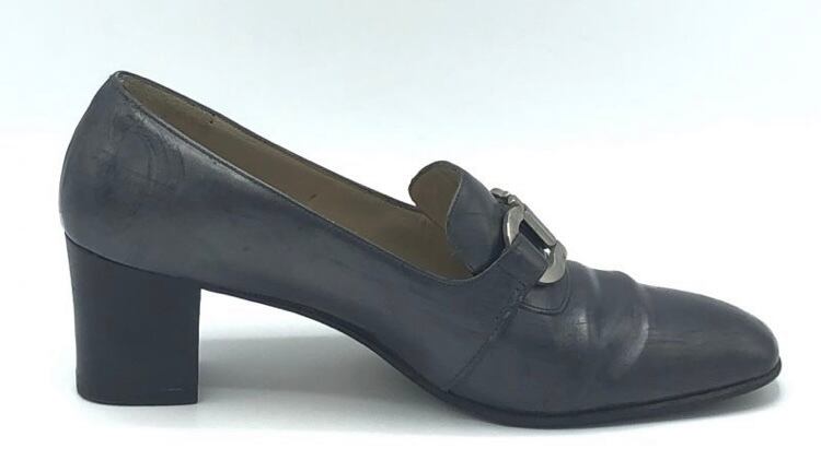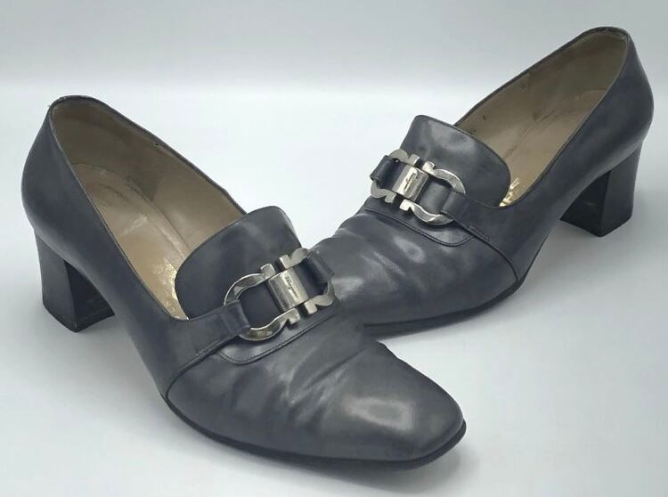 OLD FERRAGAMO(オールドフェラガモ) シルバーグレーレザーガンチーニビットヒールローファー 7C