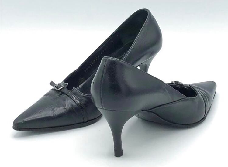 ブラックのクールなサフィアーノレザーにポインテッドトゥがかっこいい一足。