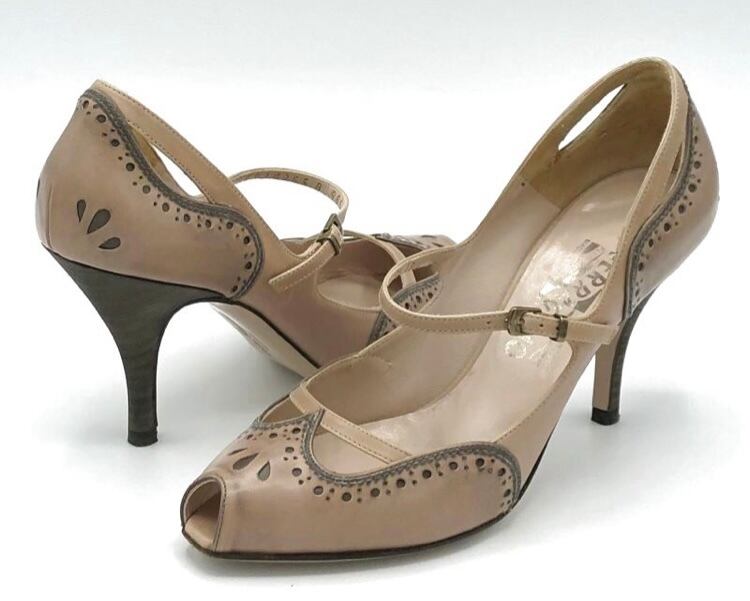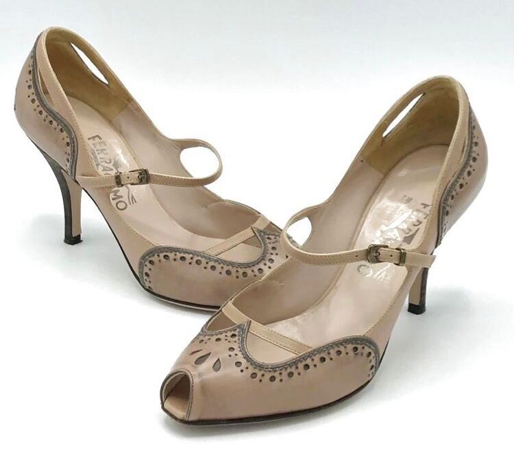 OLD FERRAGAMO(オールドフェラガモ/ヴィンテージ) スモーキーピンクカッティングレザーストラップパンプス 5 1/2C