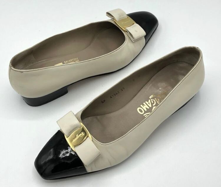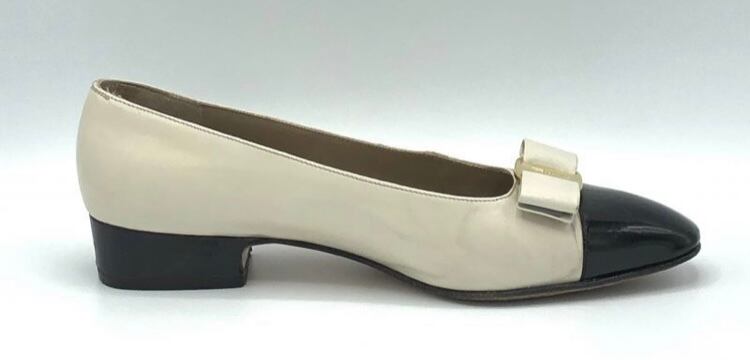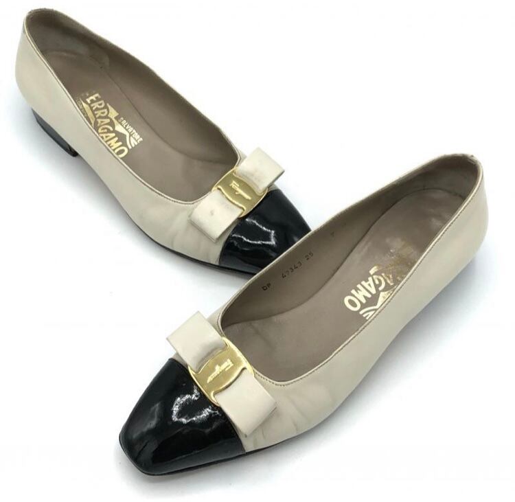 OLD FERRAGAMO(オールドフェラガモ) アイボリーホワイト×ブラックパテントバイカラーヴァラリボンパンプス 7D
