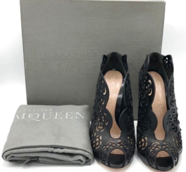 ALEXANDER MCQUEEN(アレキサンダーマックイーン)ブラックフラワーカッティングレザーブーティーサンダル38 [WOLF LAS/VACC GLASS]