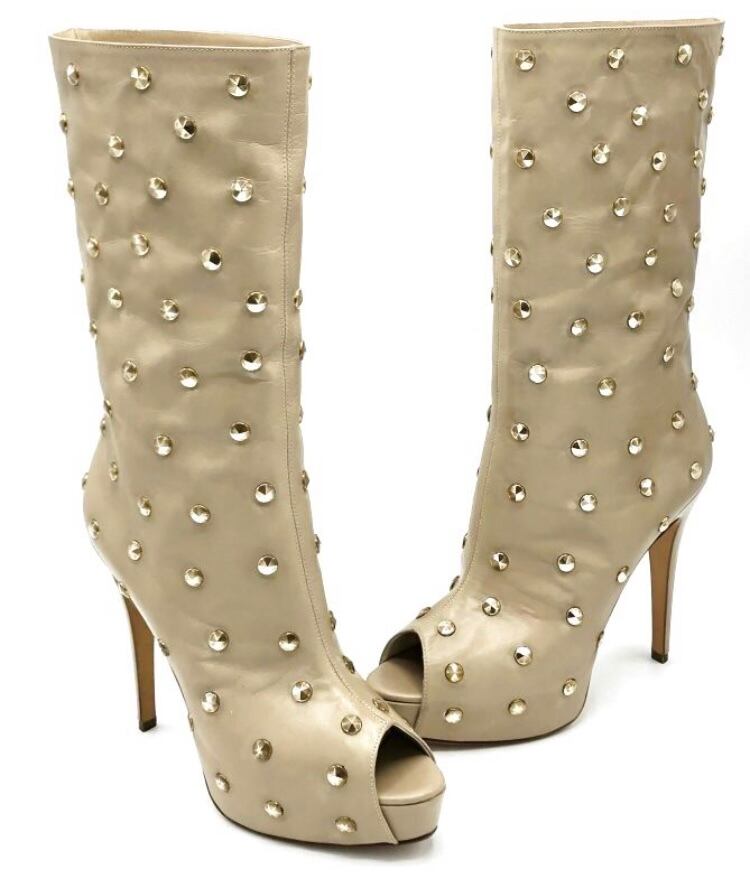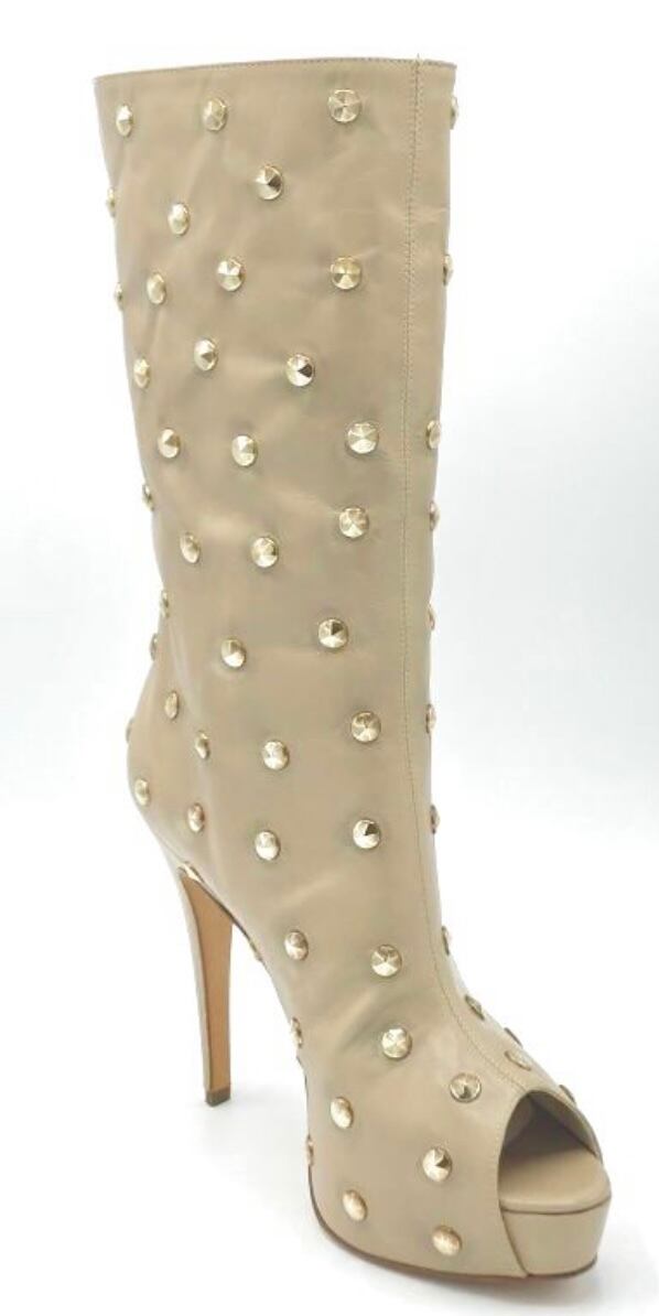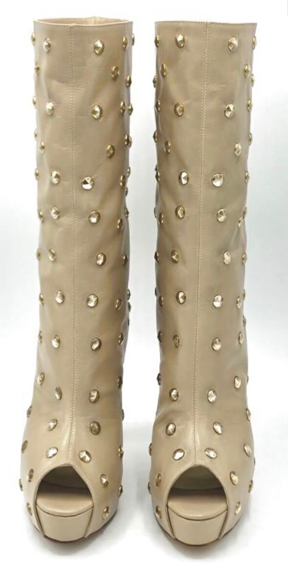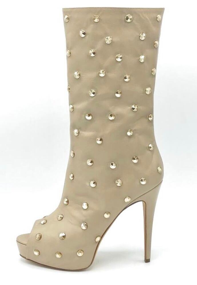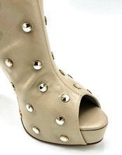 ベージュレザーゴールドスタッズ付きオープントゥプラットフォームブーツ