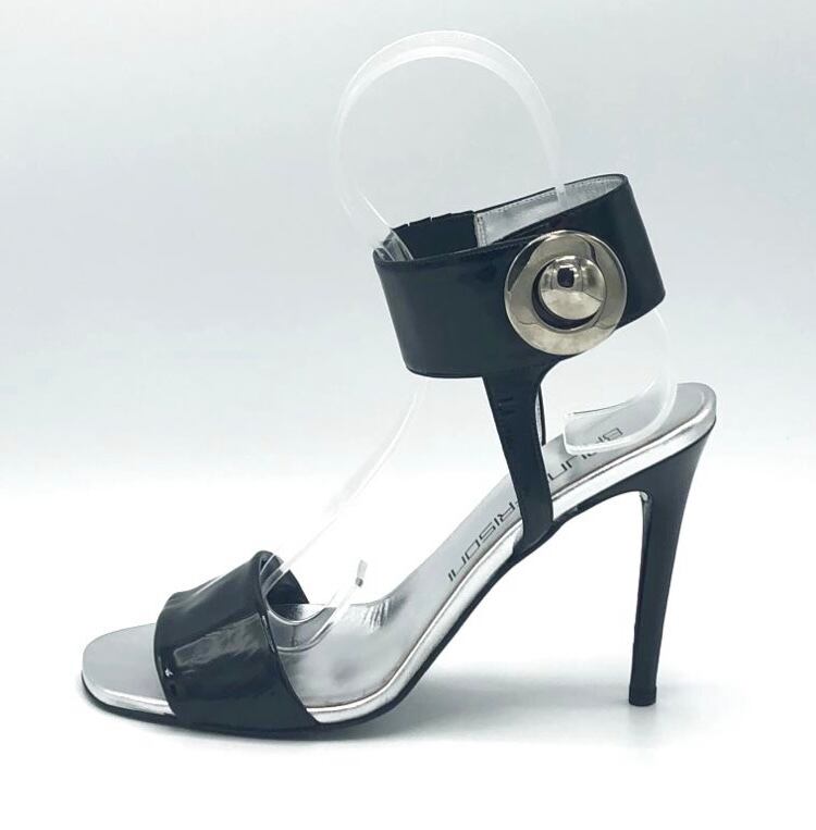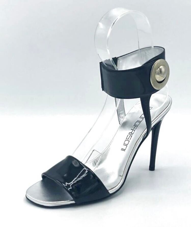 ♥太めのアンクルストラップに付いている大きなサークルモチーフとパテント素材が60'sっぽいフューチャリスティックな雰囲気のBRUNO FRISONI(ブルーノフリゾーニ)のピンヒールサンダル。