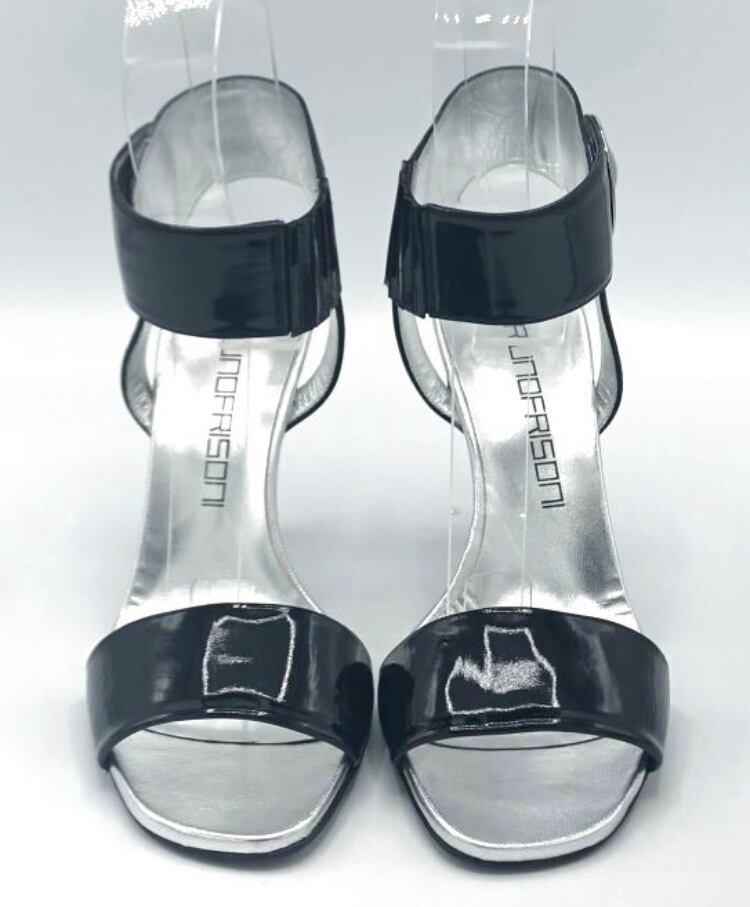 BRUNO FRISONI(ブルーノフリゾーニ)ブラックパテントサークルモチーフアンクルストラップピンヒールサンダル37•37 1/2