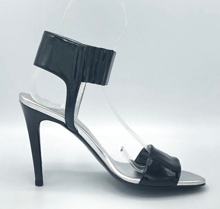 ブラックパテントサークルモチーフアンクルストラップピンヒールサンダル