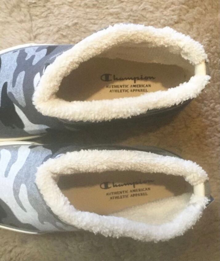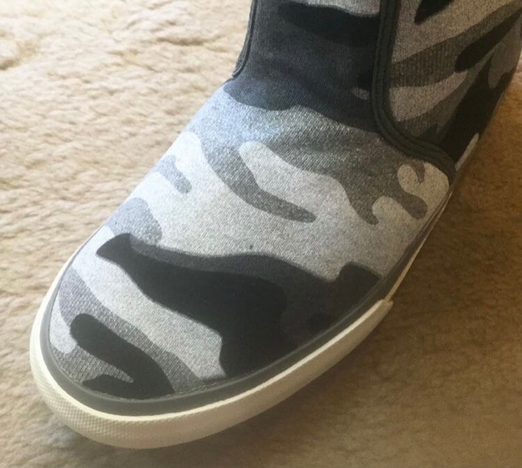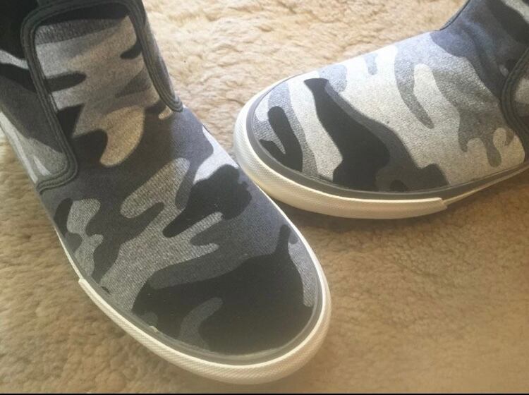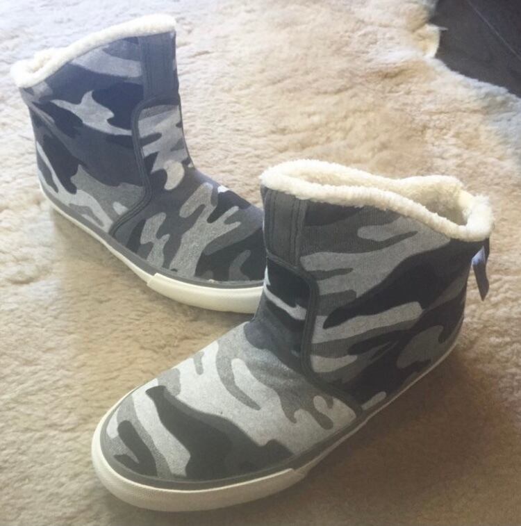 ブラックカモフラスウェット×履き口のホワイトボアがポイント。