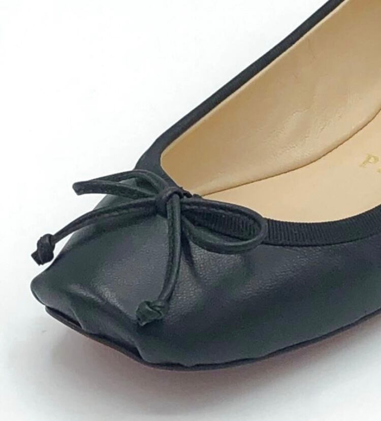 リボン付きブラックレザーバレエシューズ