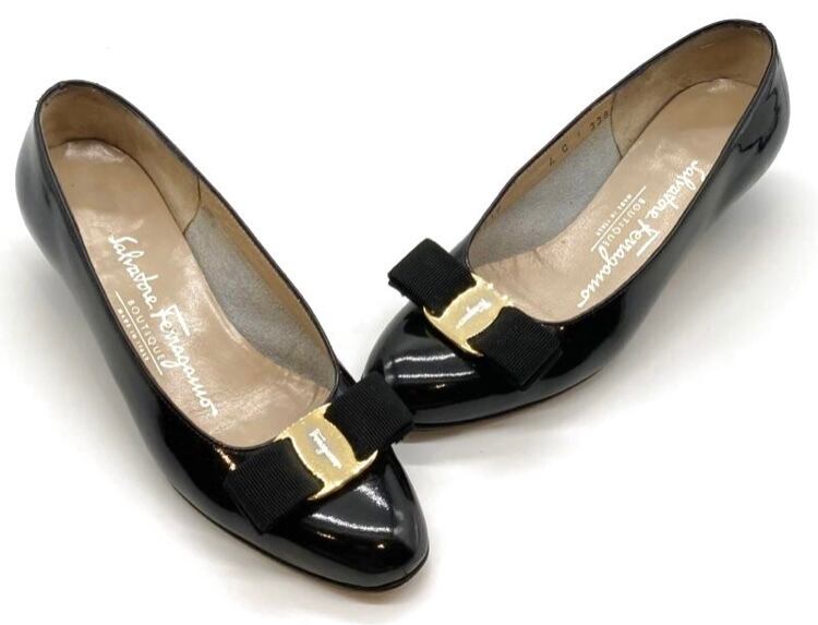 OLD FERRAGAMO(オールドフェラガモ) ブラックパテントレザーヴァラリボンパンプス 4C