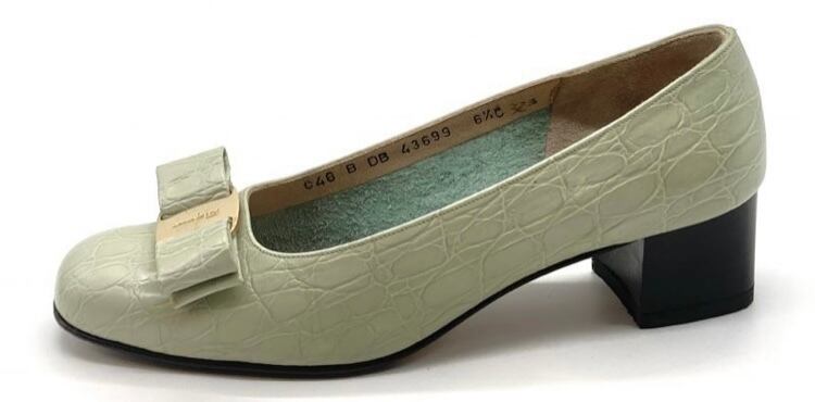 OLD FERRAGAMO(オールドフェラガモ) ミントグリーン型押しレザーヴァラリボンパンプス 6 1/2C