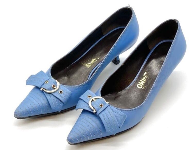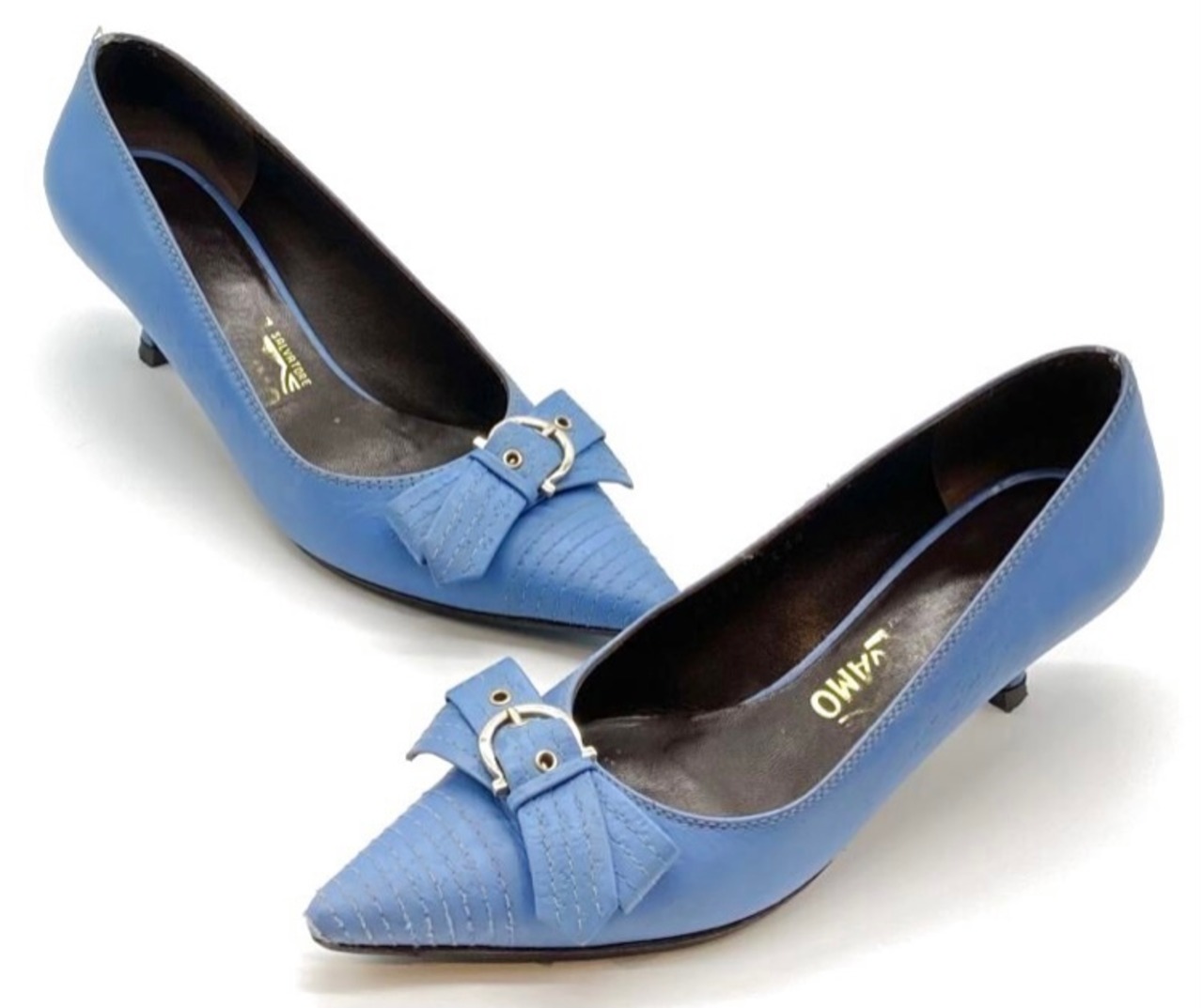 OLD FERRAGAMO(オールドフェラガモ) ライトブルーポインテッドトゥリボンパンプス 6 1/2D