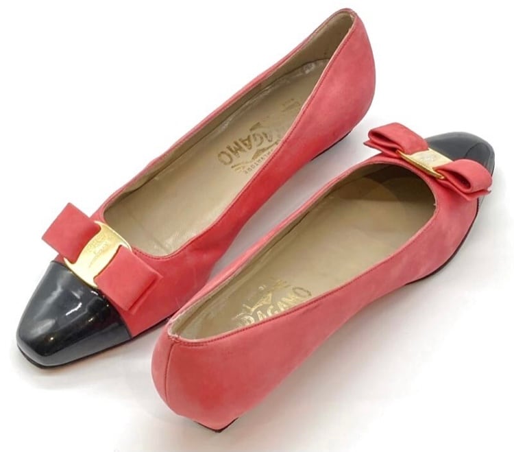 OLD FERRAGAMO(オールドフェラガモ) ピンクスエード×ブラックパテントバイカラーヴァラリボンパンプス 7B