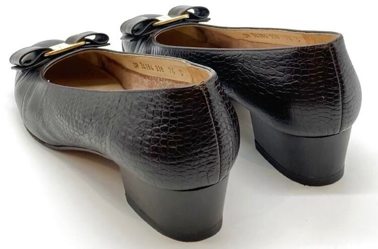 OLD FERRAGAMO(オールドフェラガモ) ダークブラウン型押しレザーヴァラリボンパンプス 7 1/2C