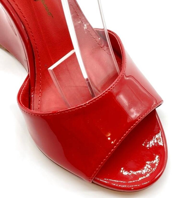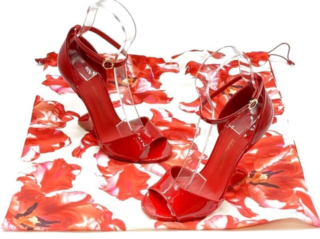 SALVATORE FERRAGAMO(サルヴァトーレフェラガモ)レッドパテントウェッジアンクルストラップオープントゥサンダル 6C