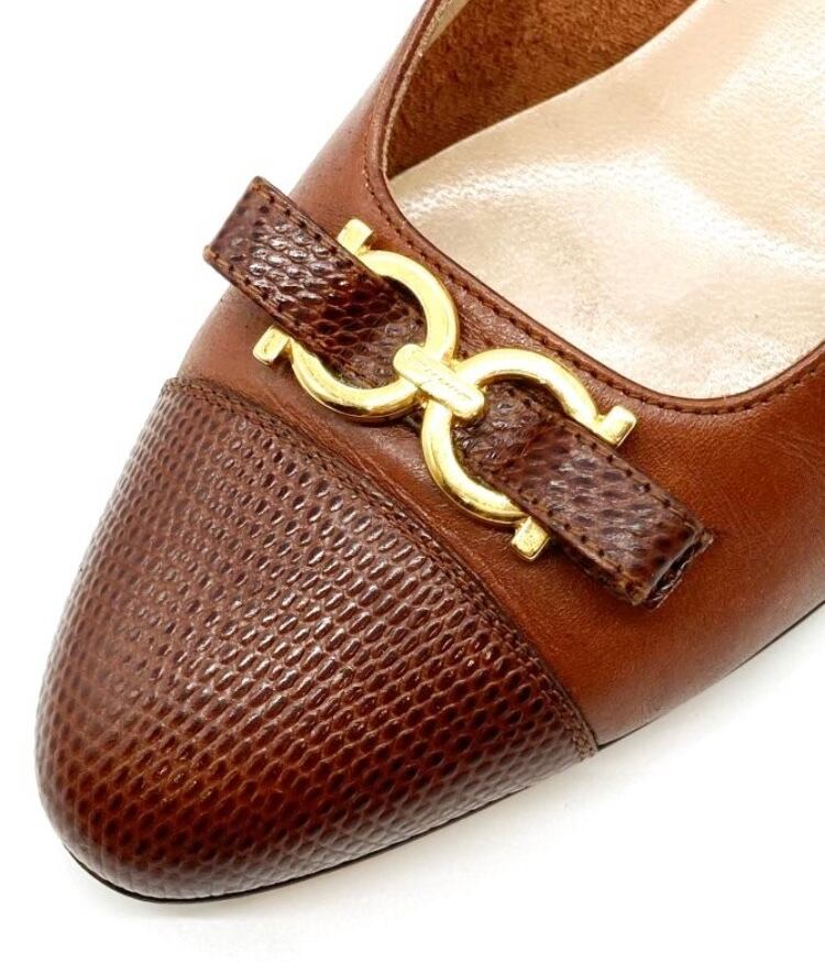 OLD FERRAGAMO(オールドフェラガモ) ブラウンレザー×ガンチーニゴールド金具リボンパンプス 6 1/2B