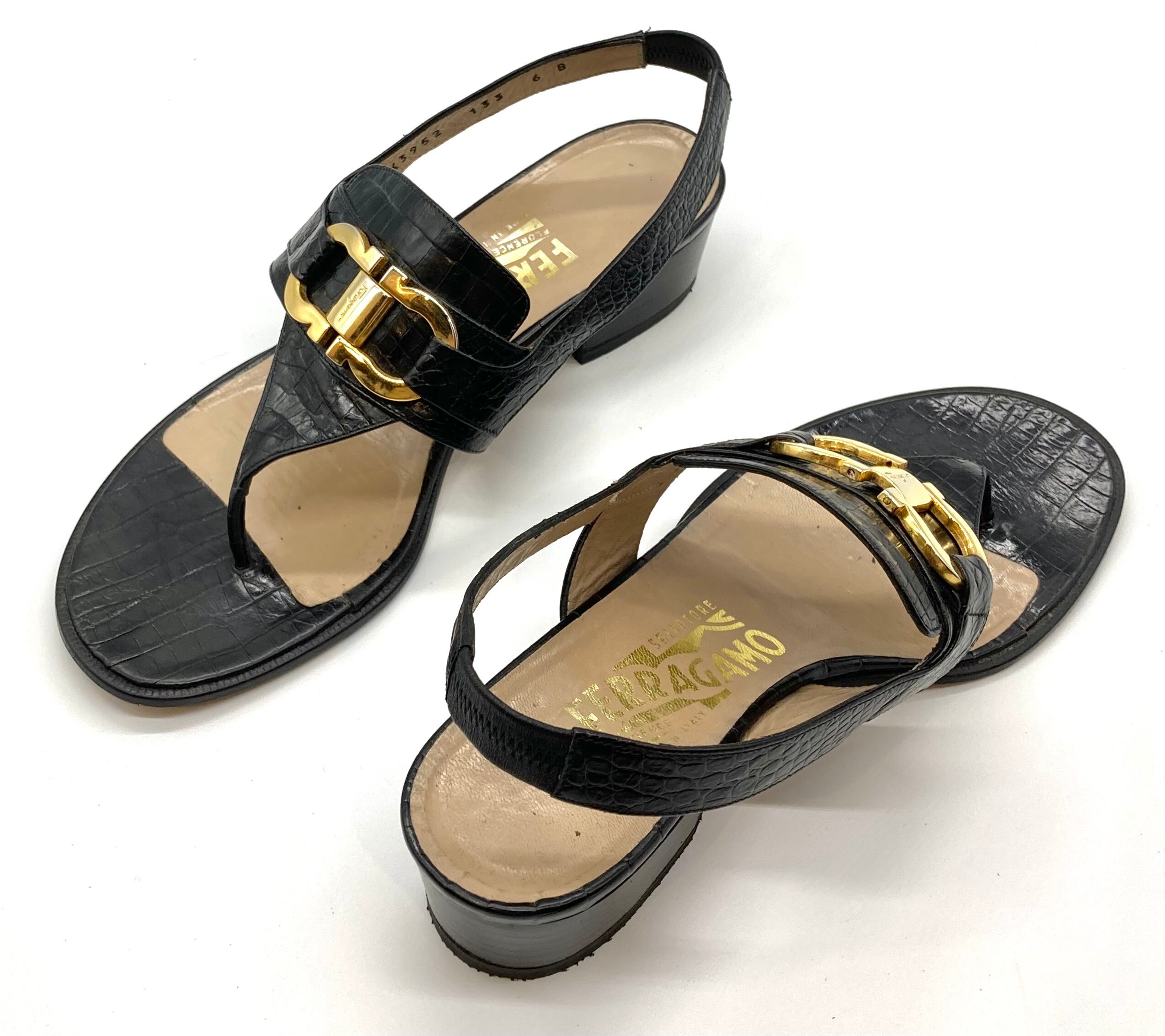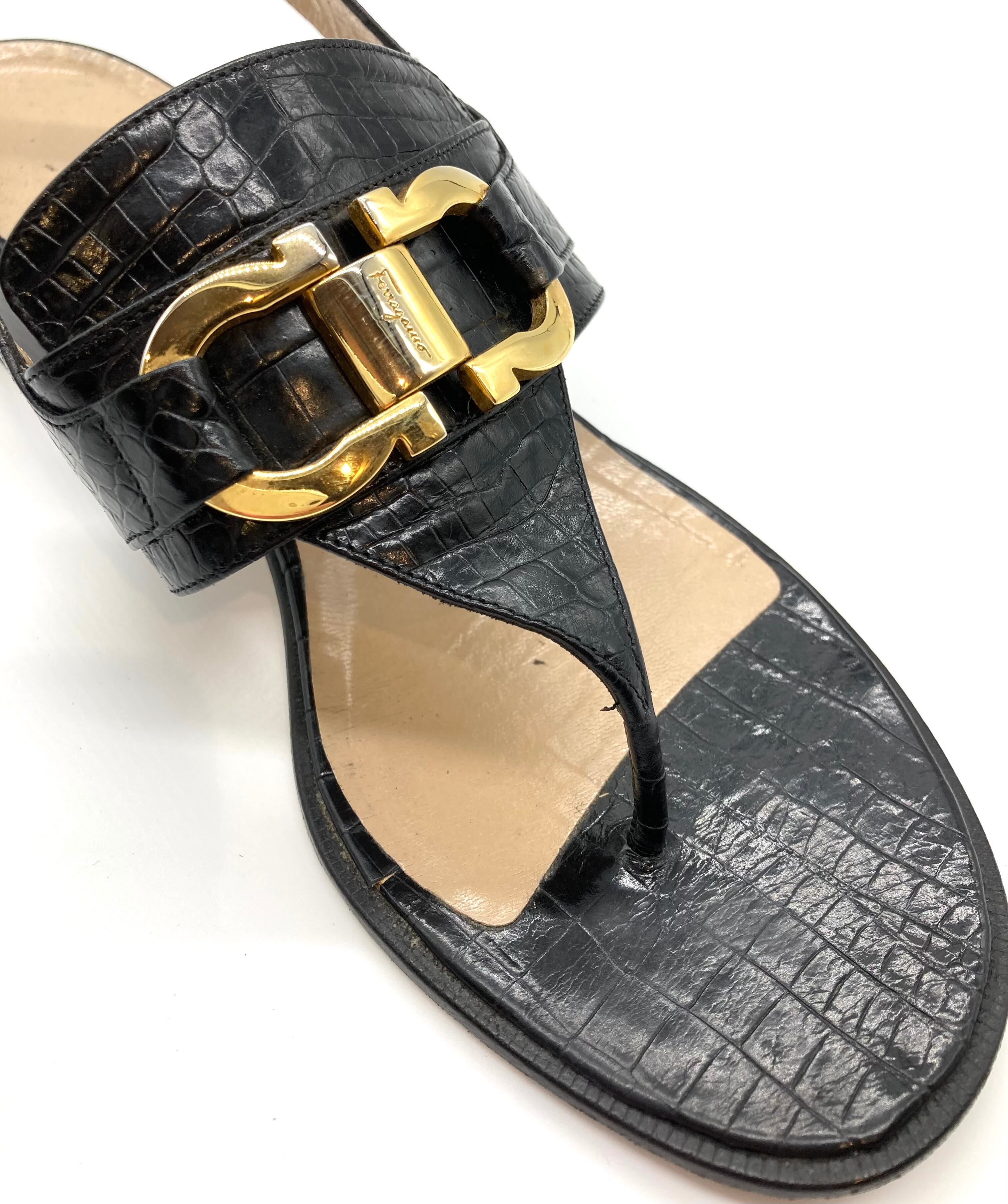 OLD FERRAGAMO(オールドフェラガモ) ブラック型押しレザー×ゴールドガンチーニ金具付きトングサンダル 6B