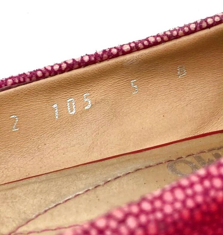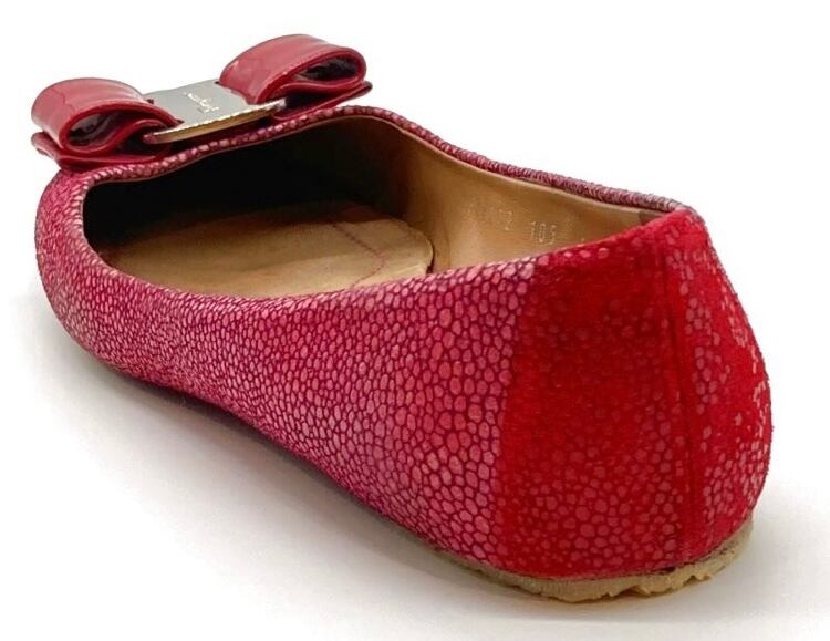 コンビ素材と赤っぽいピンクがキュートなフェラガモの定番人気のヴァラリボンパンプスのフラットバージョンがこのヴァリナ。