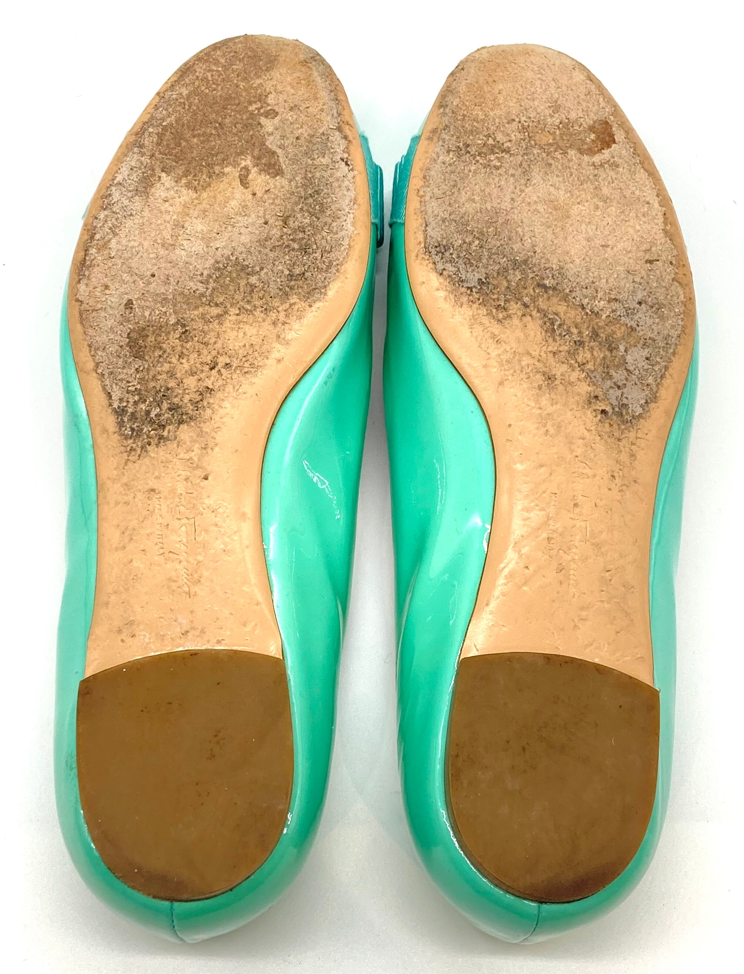 足元がパッと華やぐ、きれいなミントグリーンのパテントがキュート。