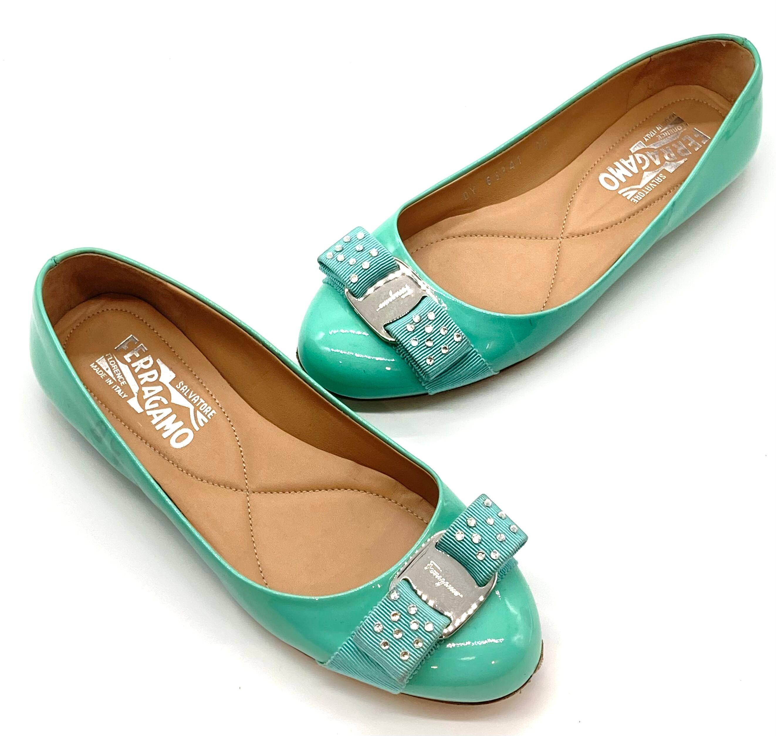 ミントグリーンパテントヴァリナリボンフラットシューズ(リボンスワロリメイク)