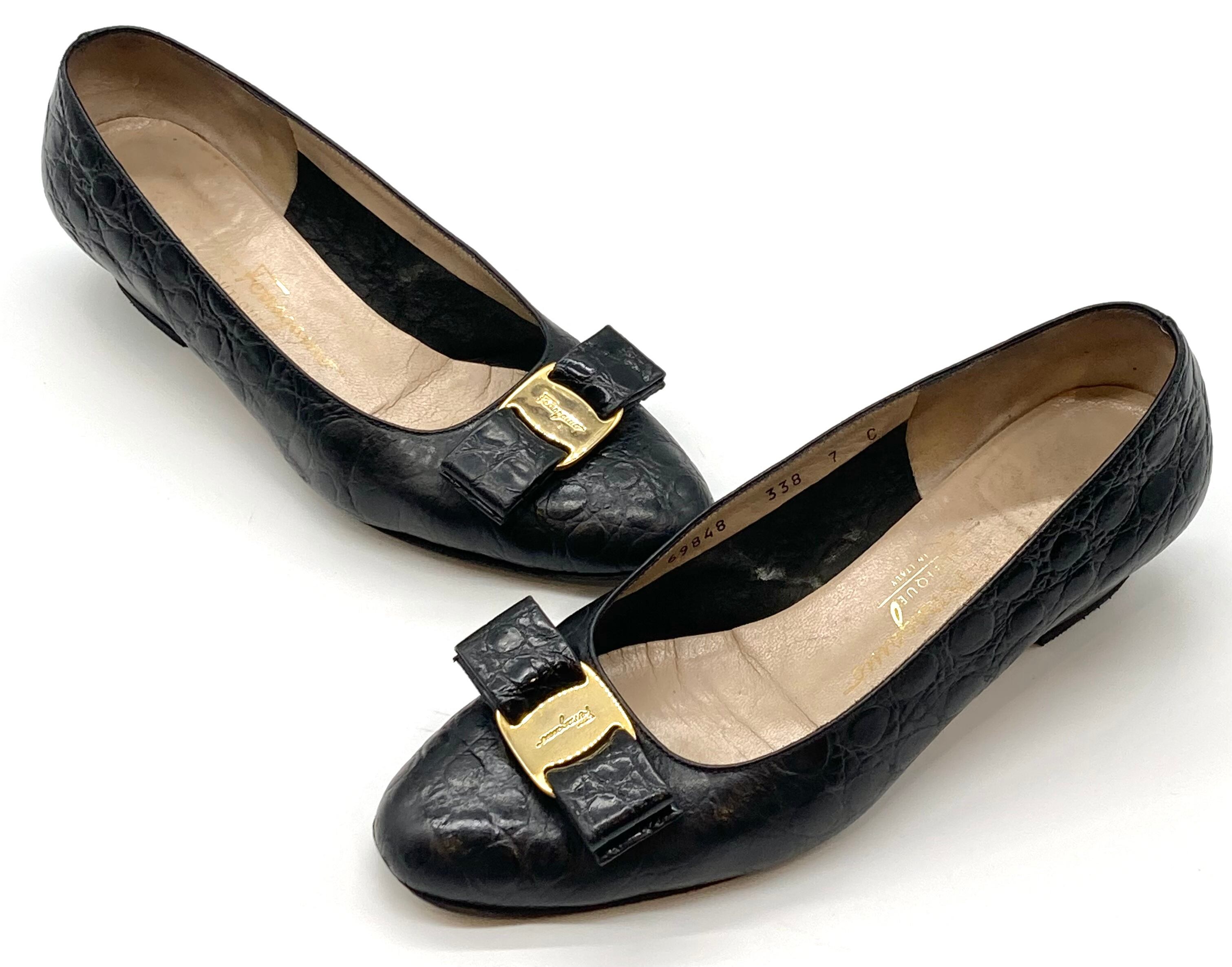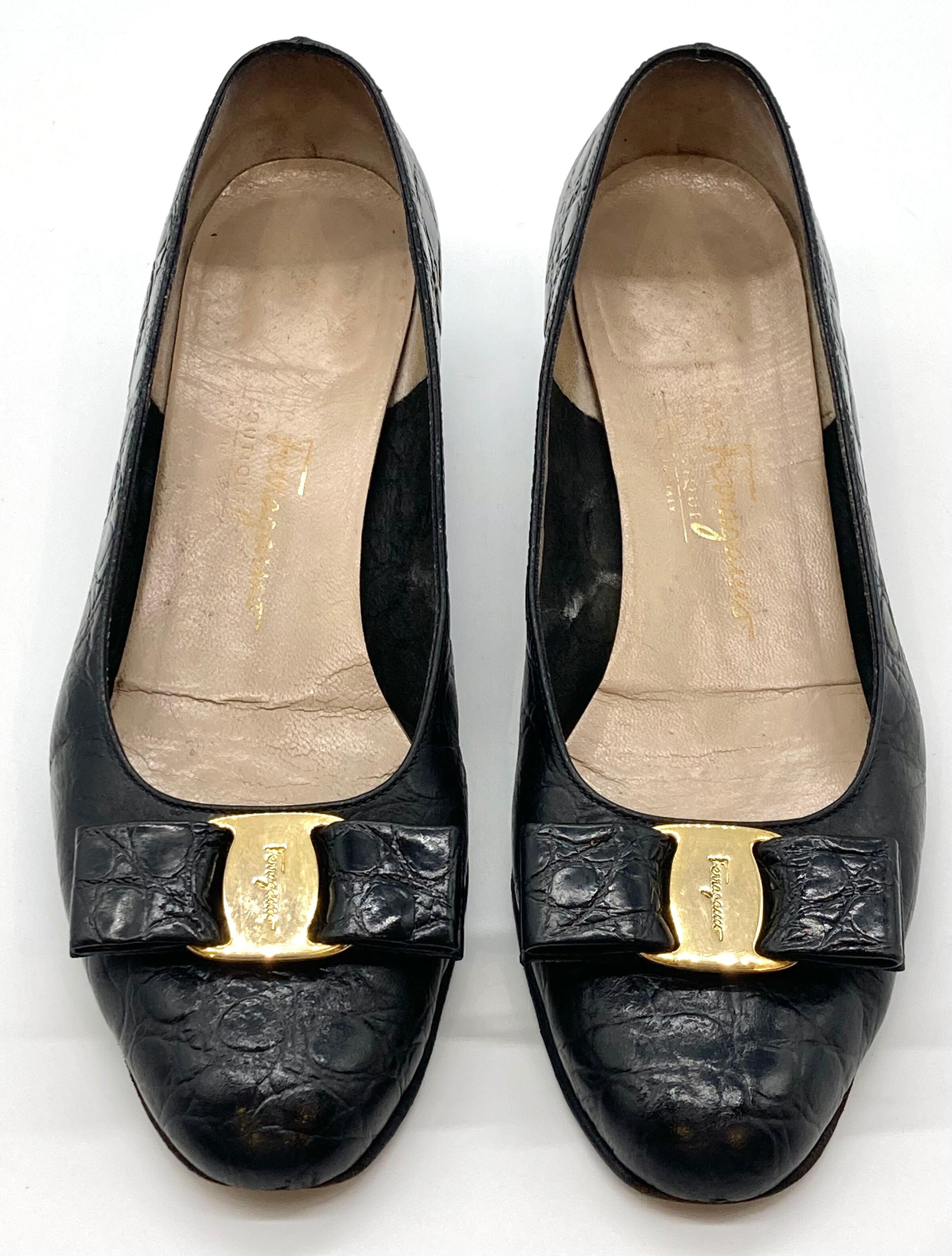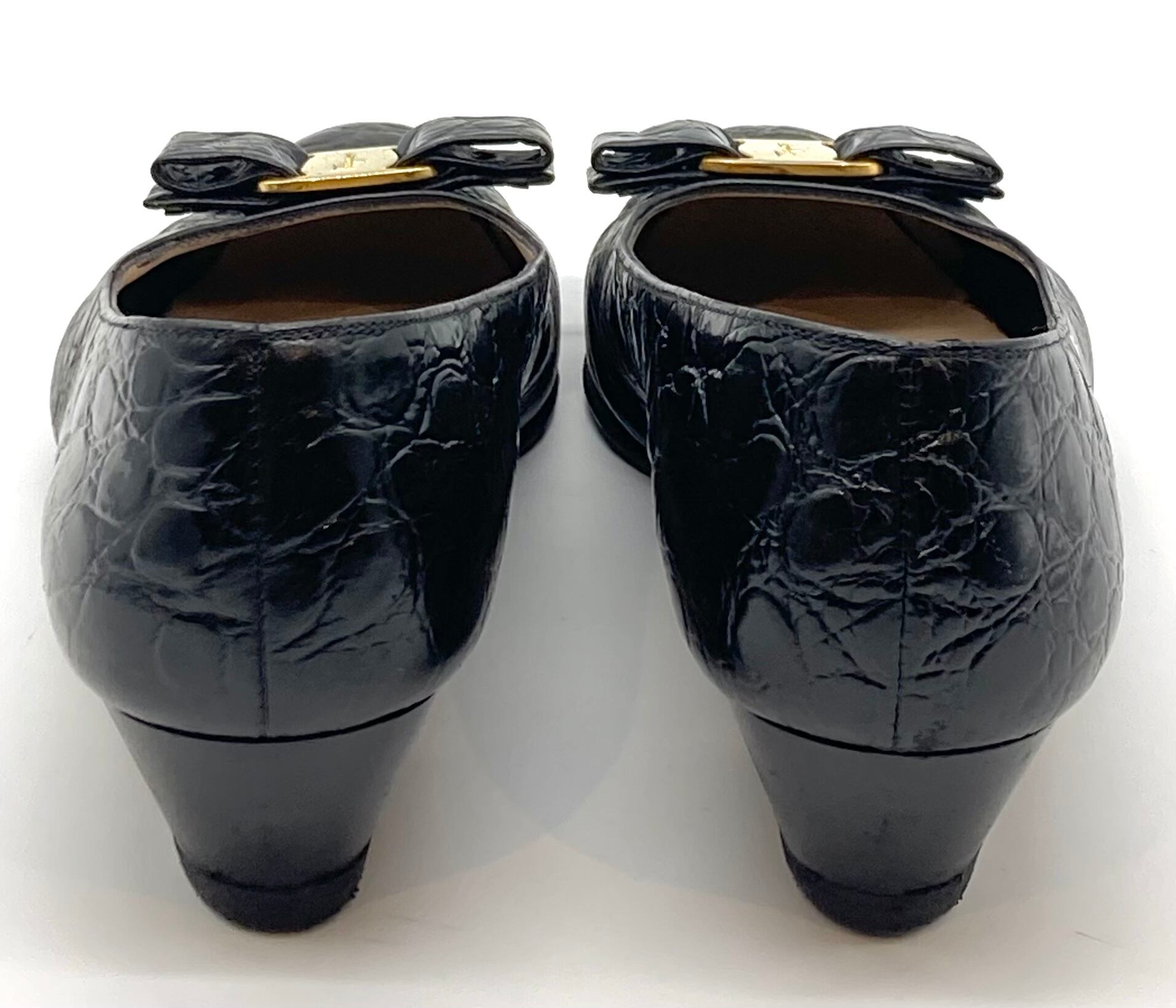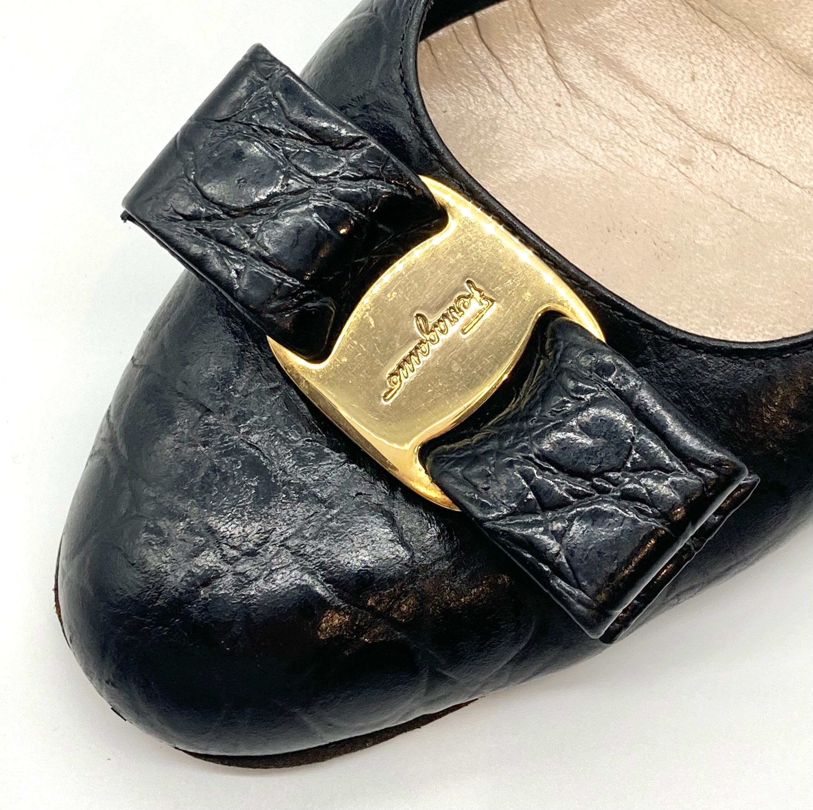 OLD FERRAGAMO(オールドフェラガモ) ブラック型押しレザーヴァラリボンパンプス 7C
