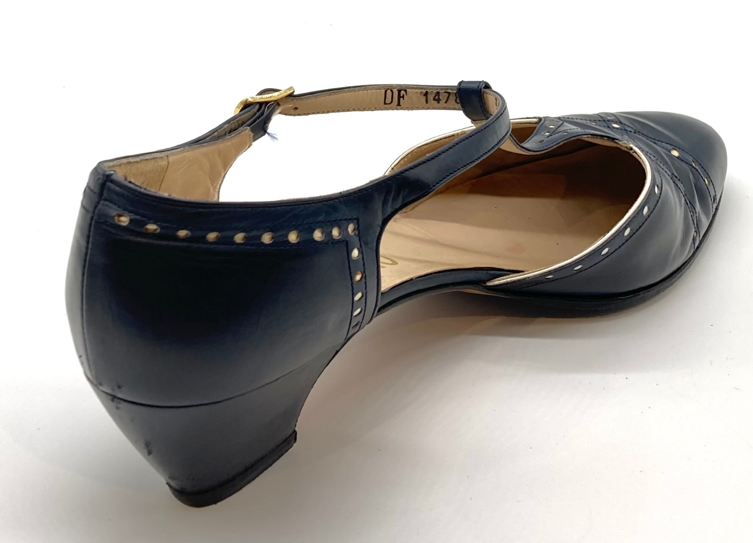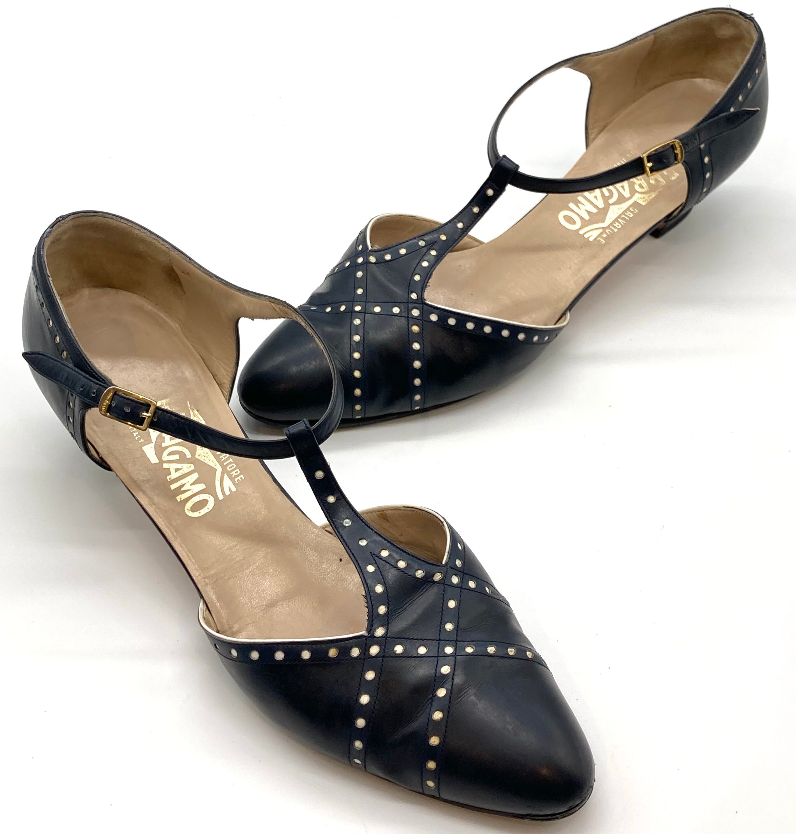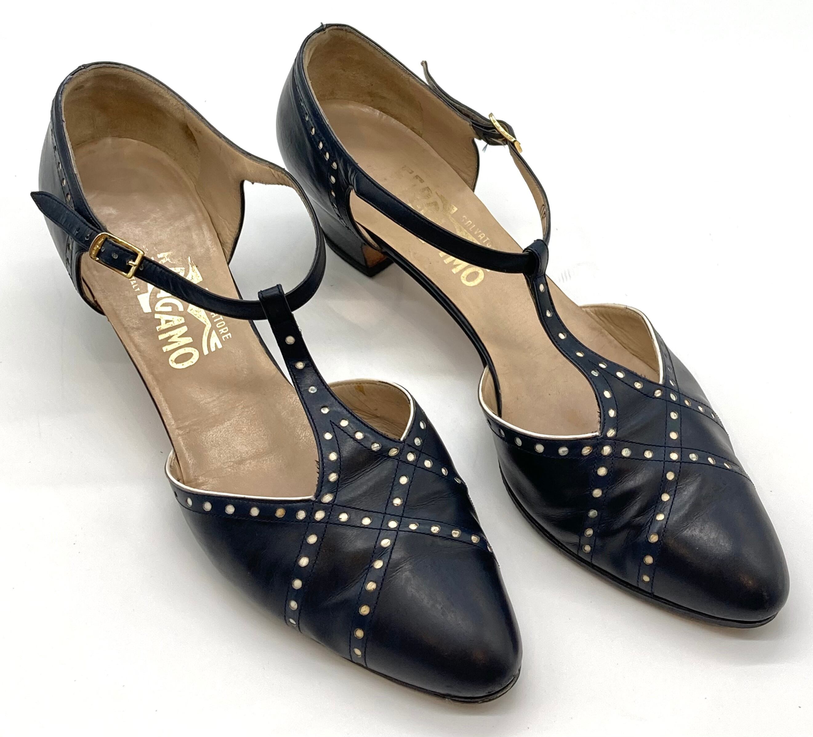 OLD FERRAGAMO(オールドフェラガモ) ネイビー×ホワイトパンチングレザーTストラップパンプス 9B