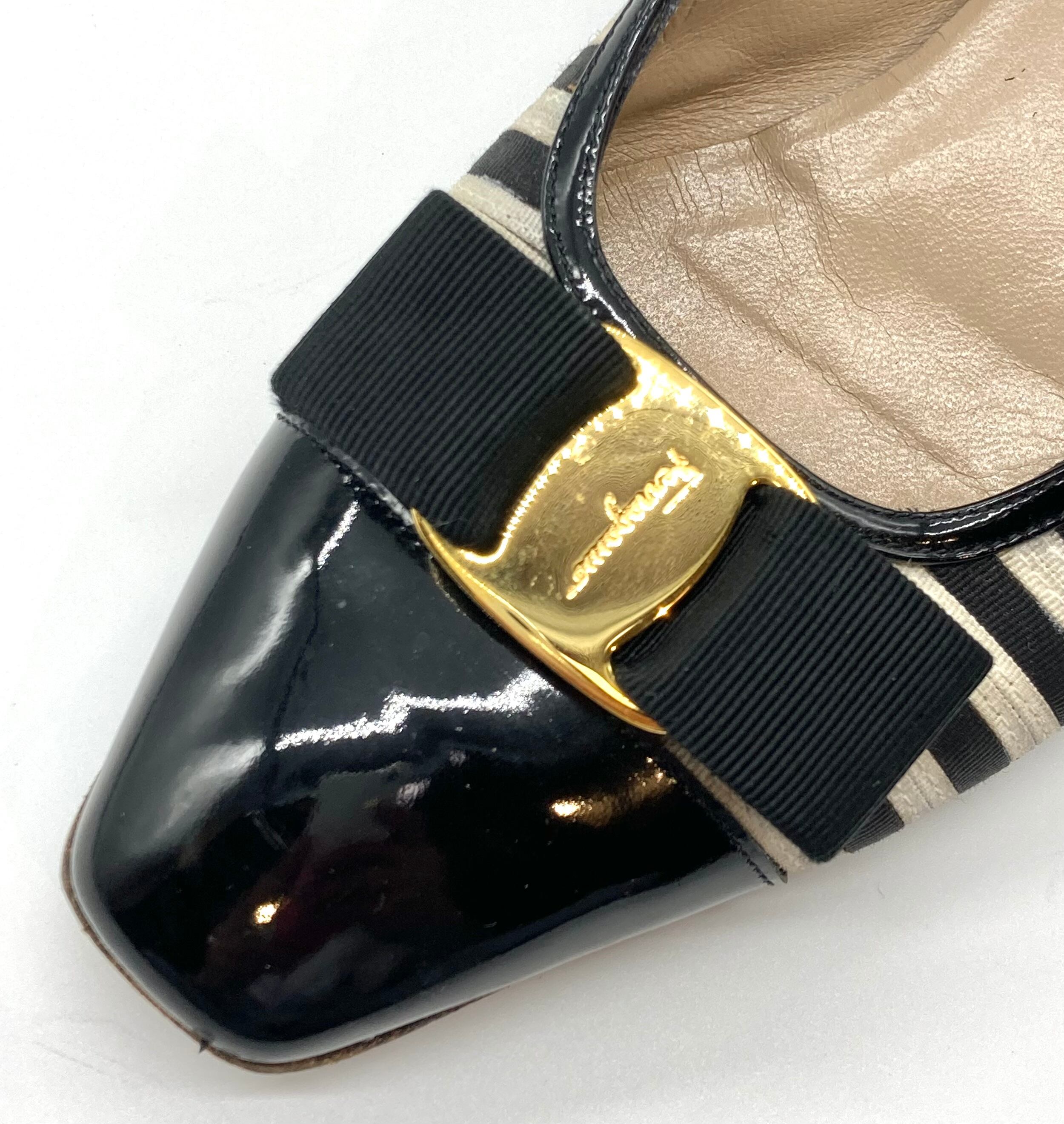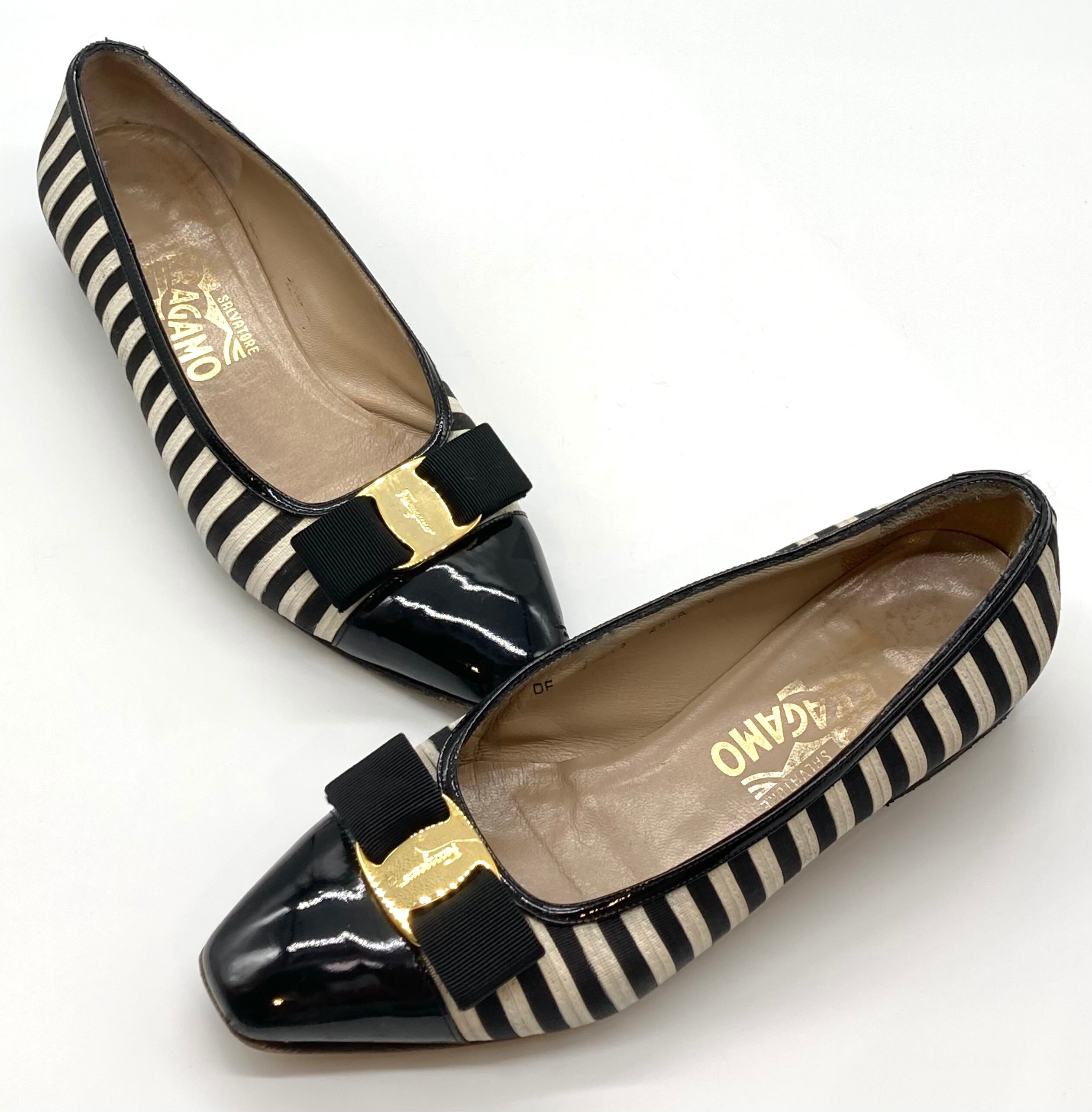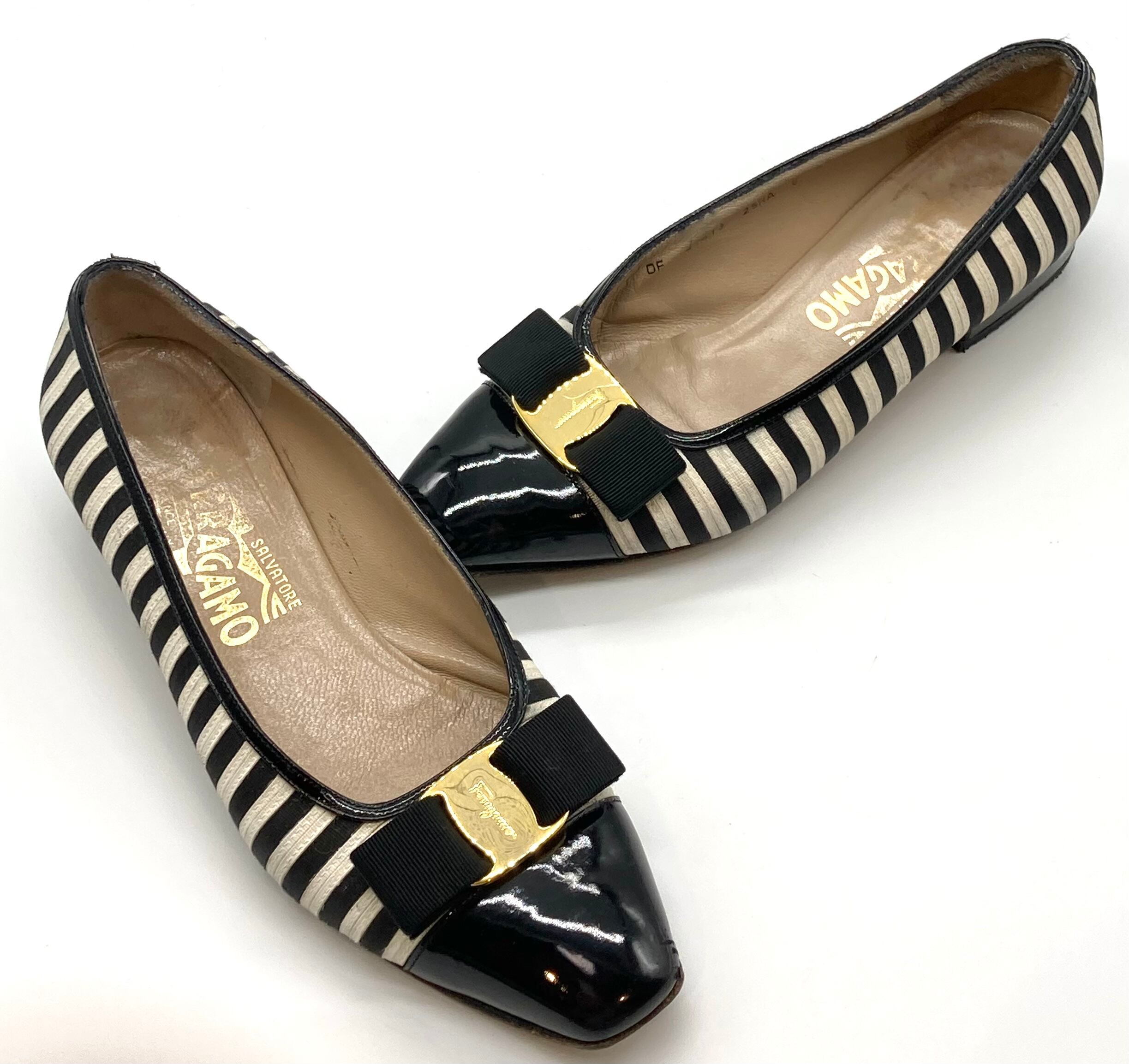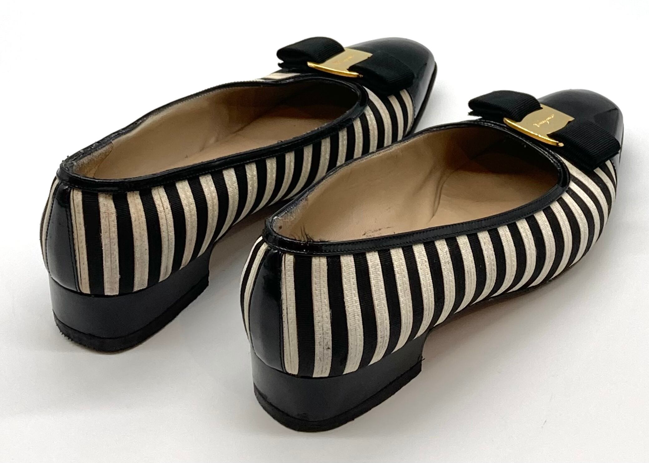 OLD FERRAGAMO(オールドフェラガモ) ブラック×ホワイトボーダーヴァラリボンパンプス 6D