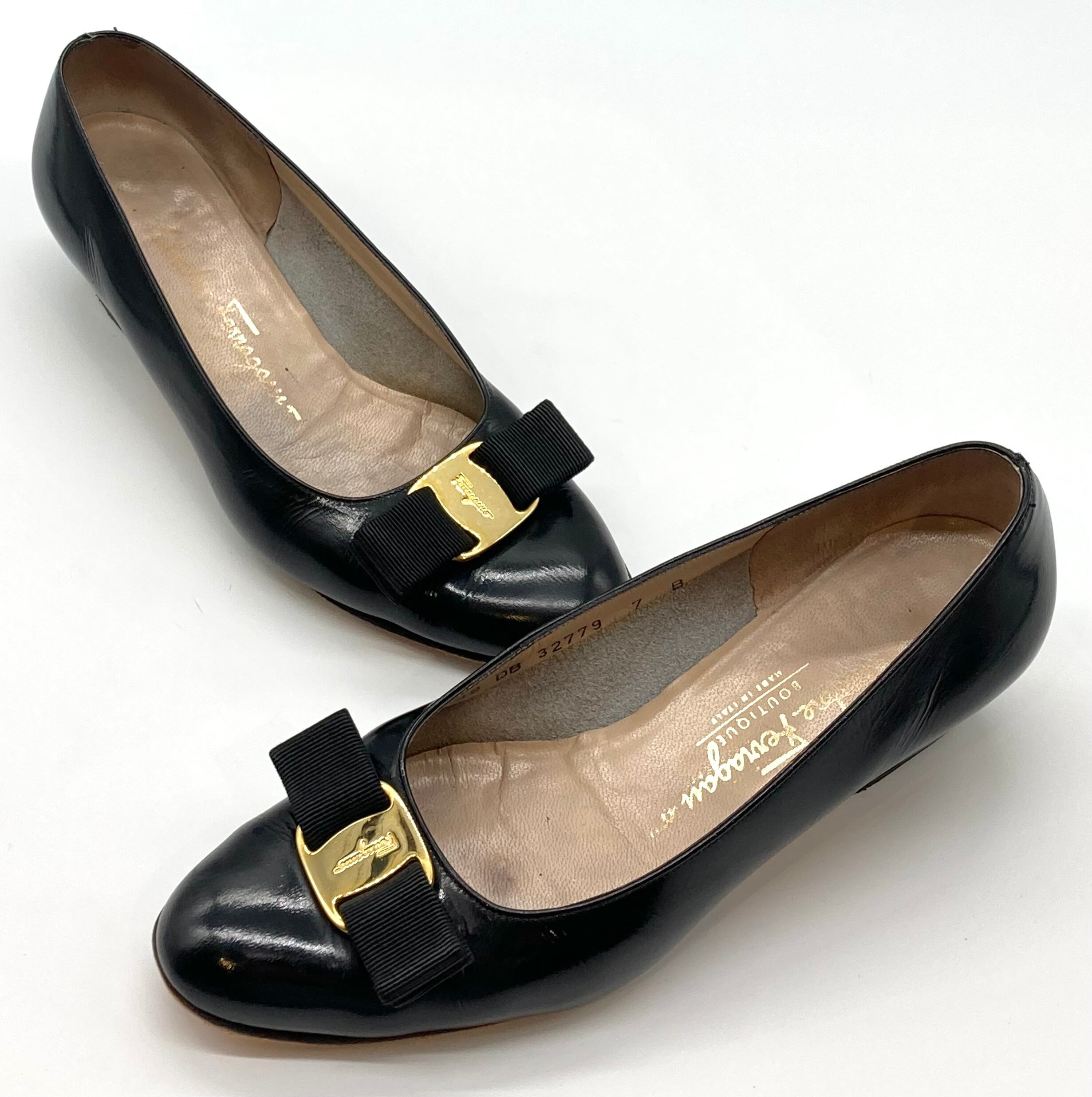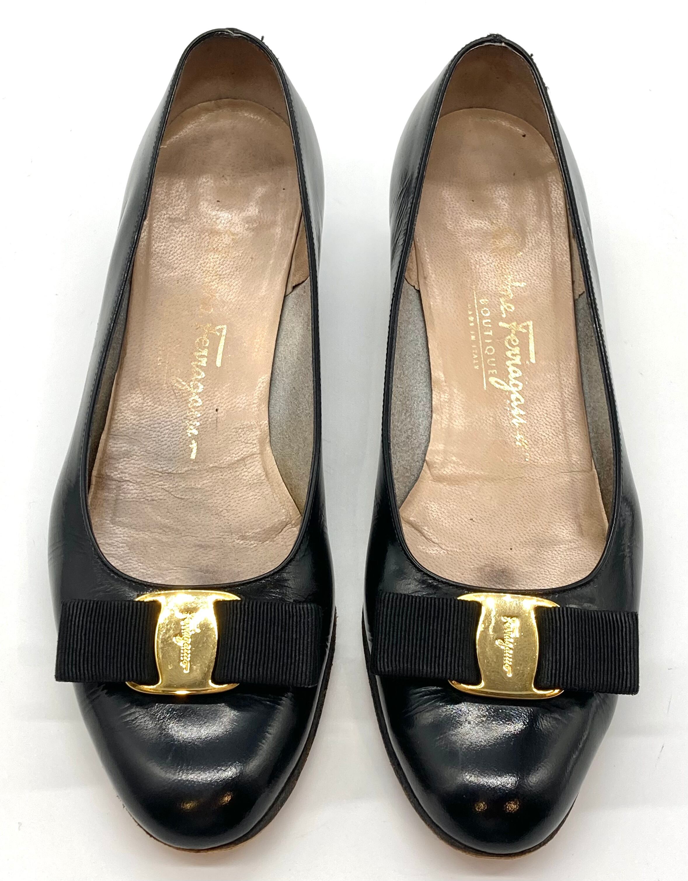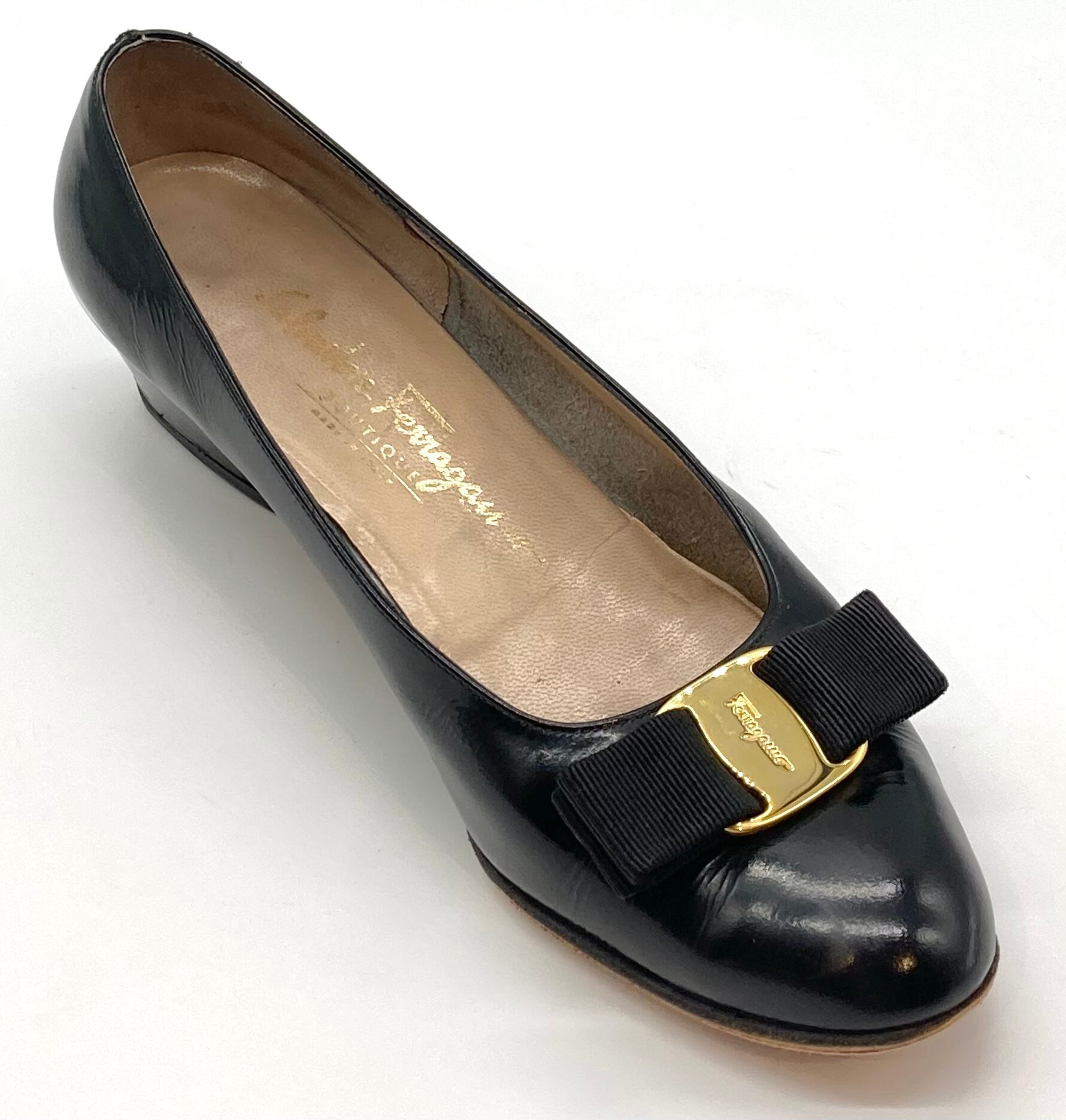 OLD FERRAGAMO(オールドフェラガモ) ブラックパテントヴァラリボンパンプス 7B