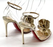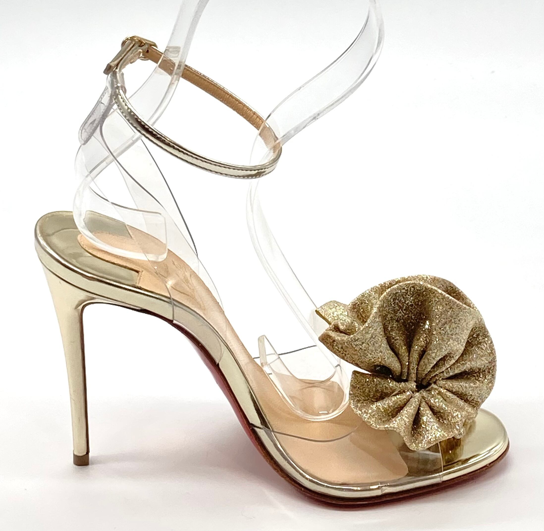 Christian Louboutin(クリスチャンルブタン)ゴールドグリッターラメコサージュ×PVCアンクルストラップサンダル 35 [FOSSILIZA]