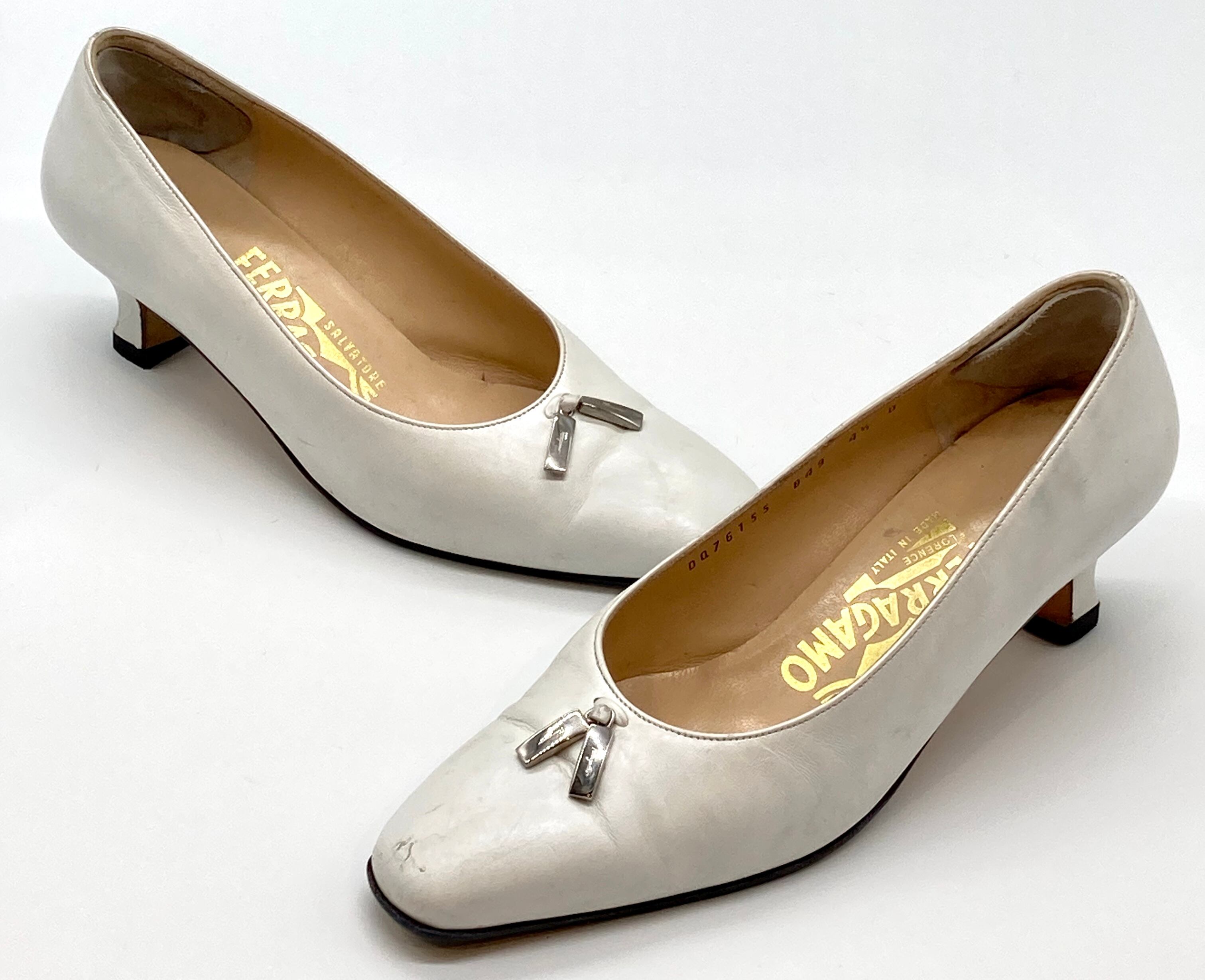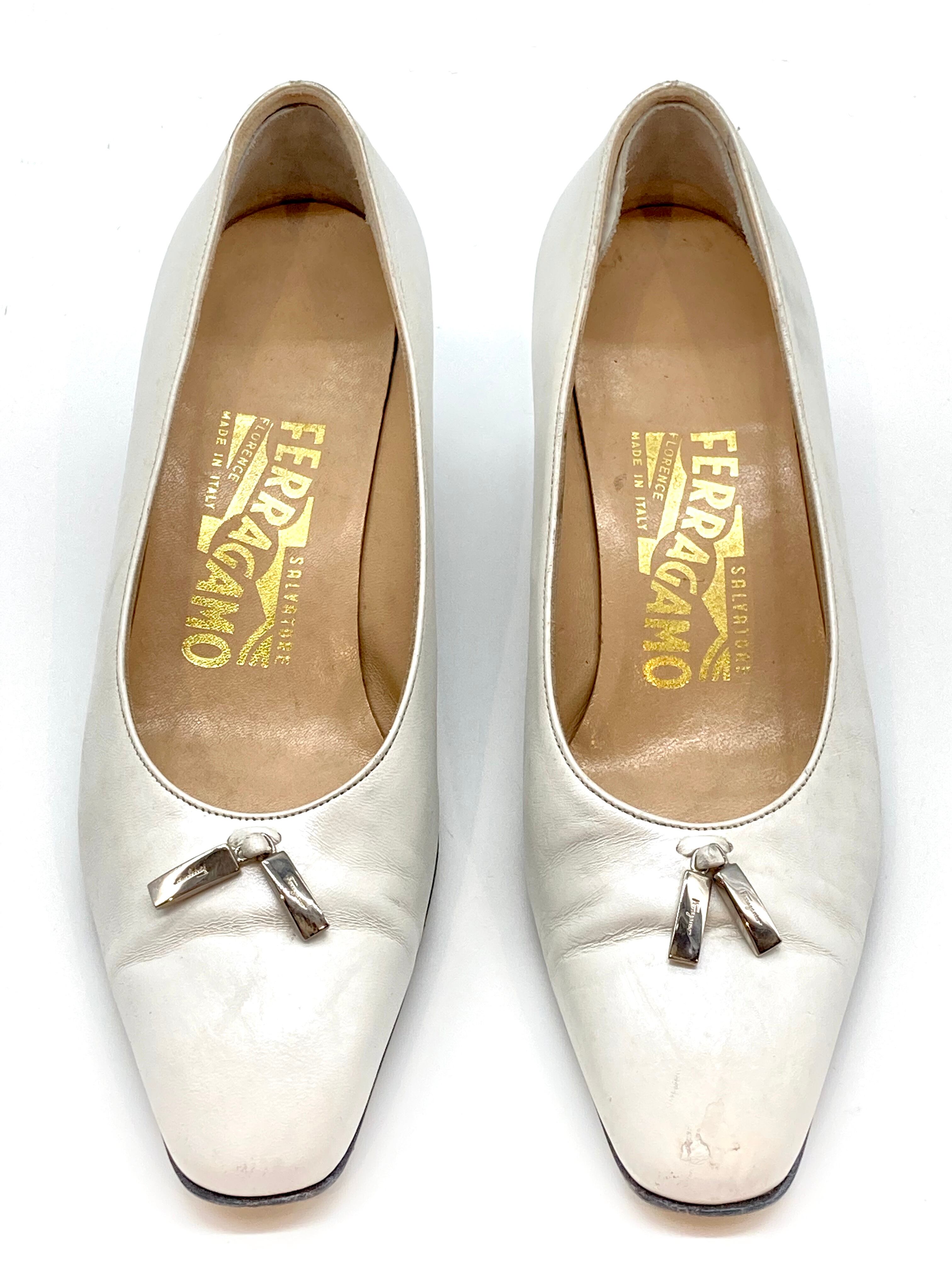 OLD FERRAGAMO(オールドフェラガモ/ヴィンテージ) ホワイトレザー×シルバーロゴタッセル金具付きパンプス 4 1/2D