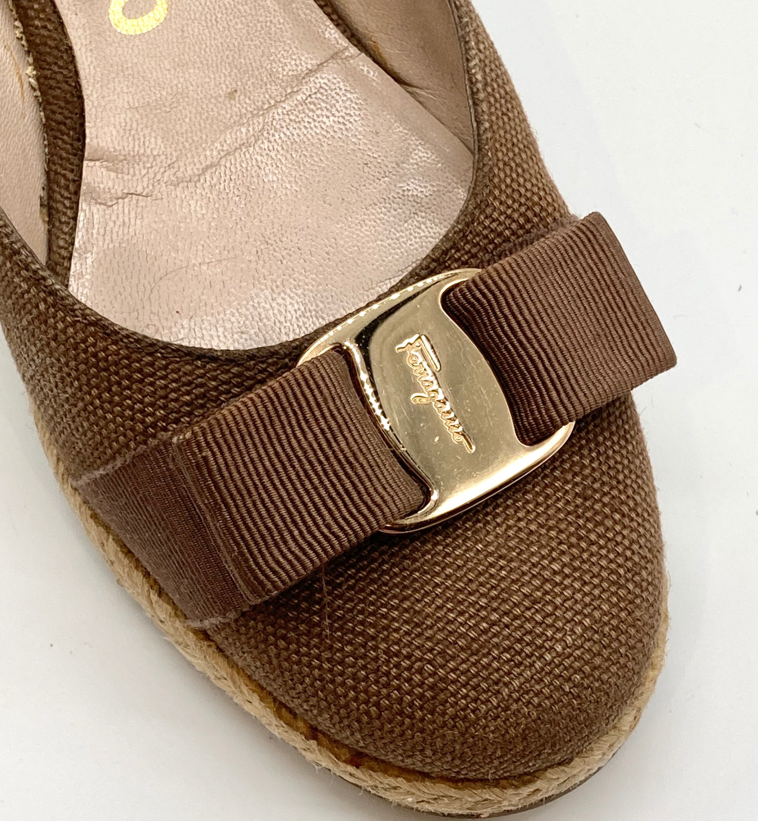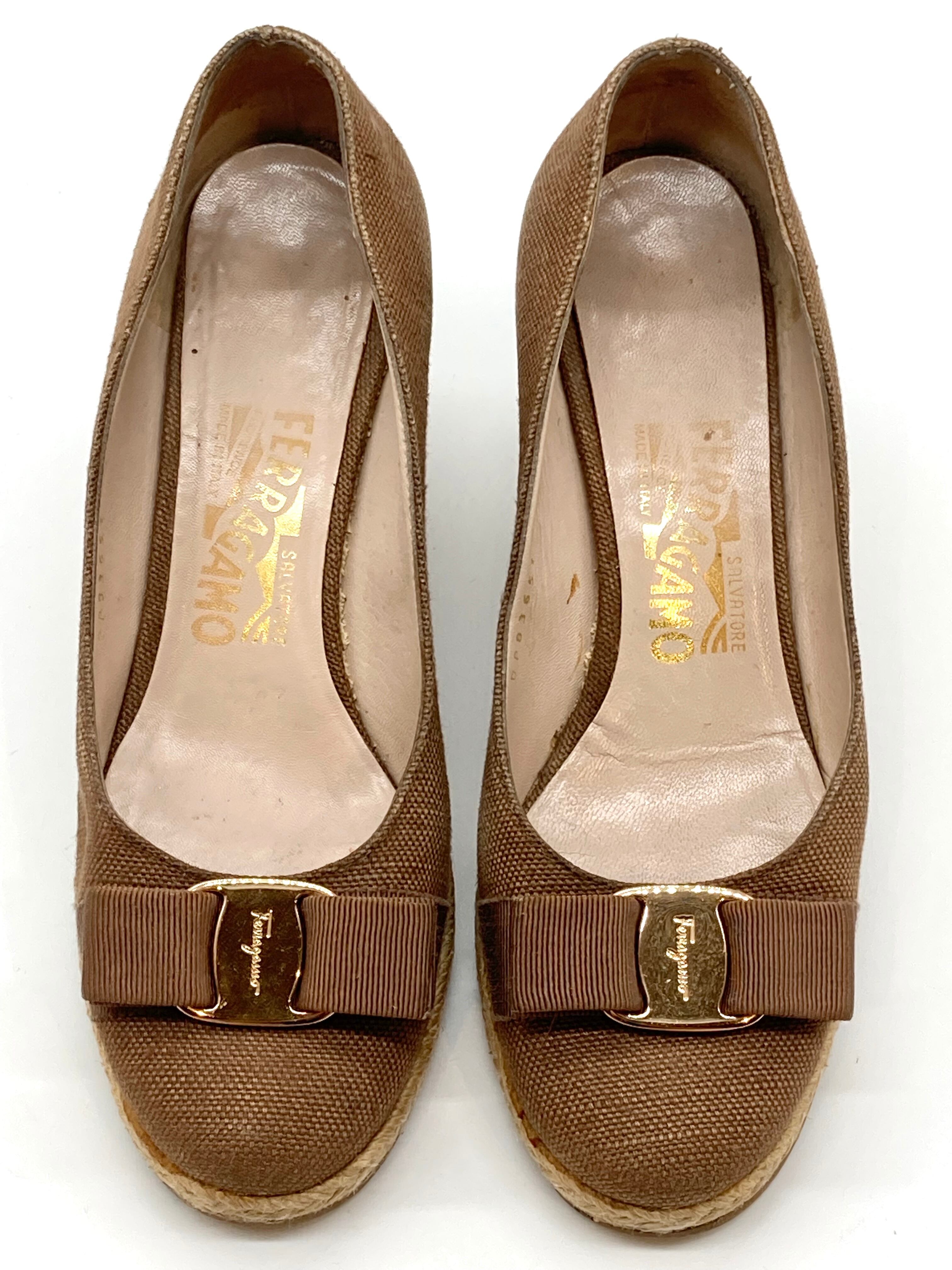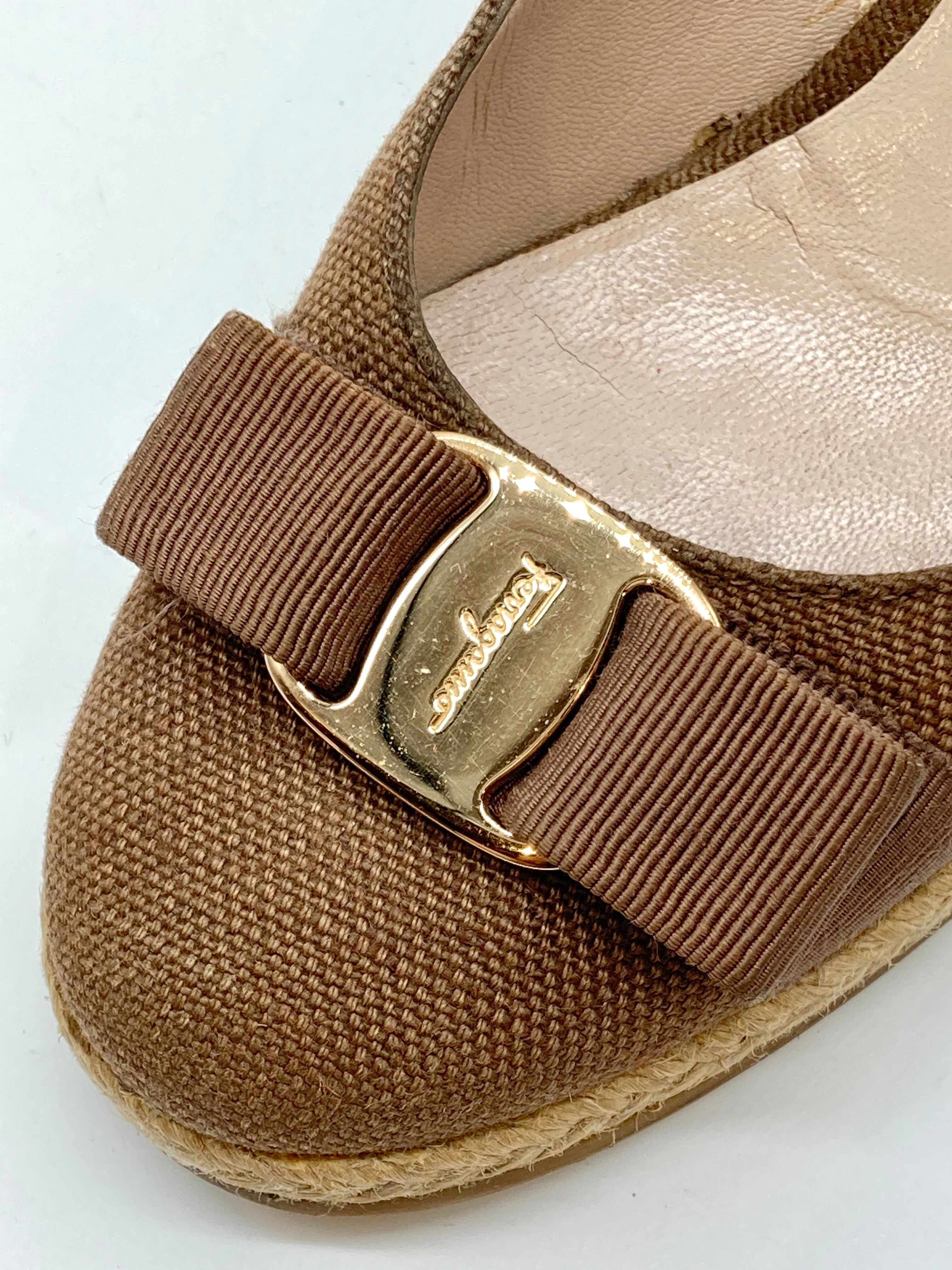 OLD FERRAGAMO(オールドフェラガモ) ブラウンキャンバスヴァラリボンウェッジパンプス 6B